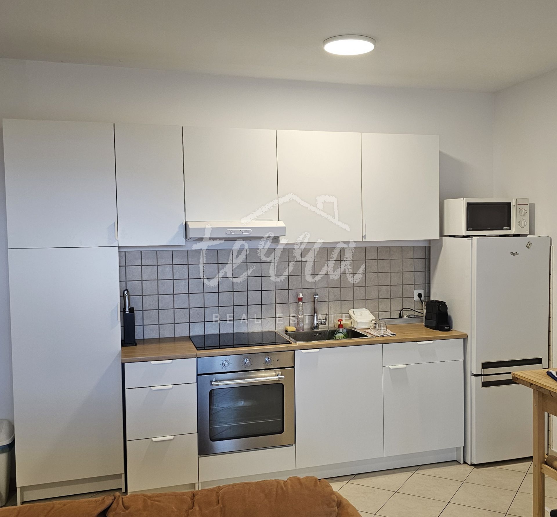Nova moderna kuhinja s bijelim elementima, opremljena svim potrebnim uređajima.