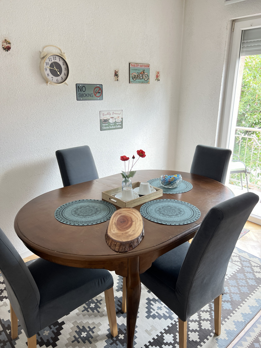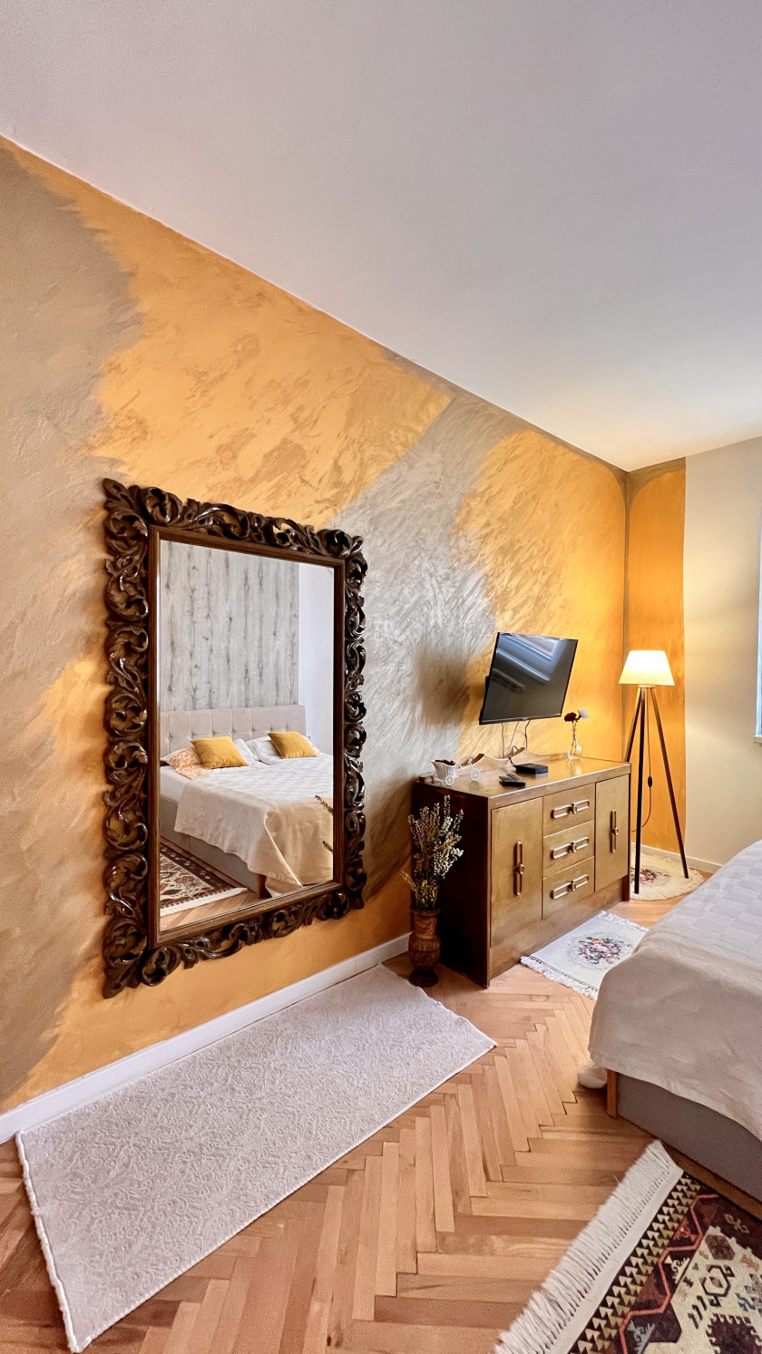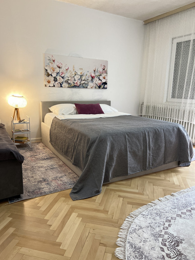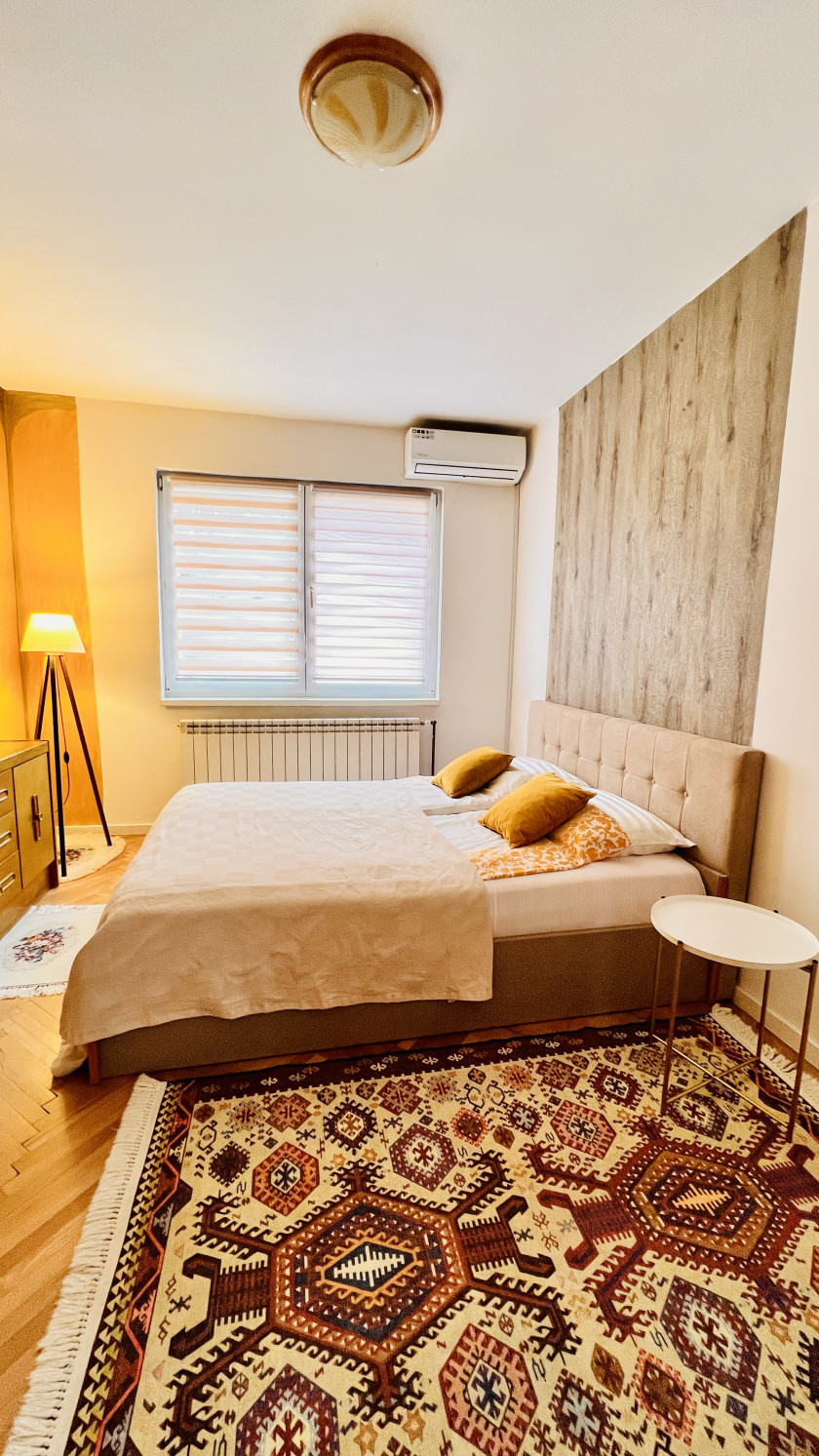 Opis: Lijepo uređen apartman sa dvije spavaće sobe, komplet opremljenom kuhinjom sa trpezarijom, kupatilo, dva balkona, u svakoj sobi ima klima uređaj, parking je osiguran video nadzorom.