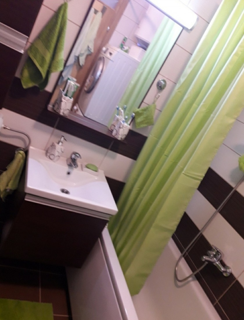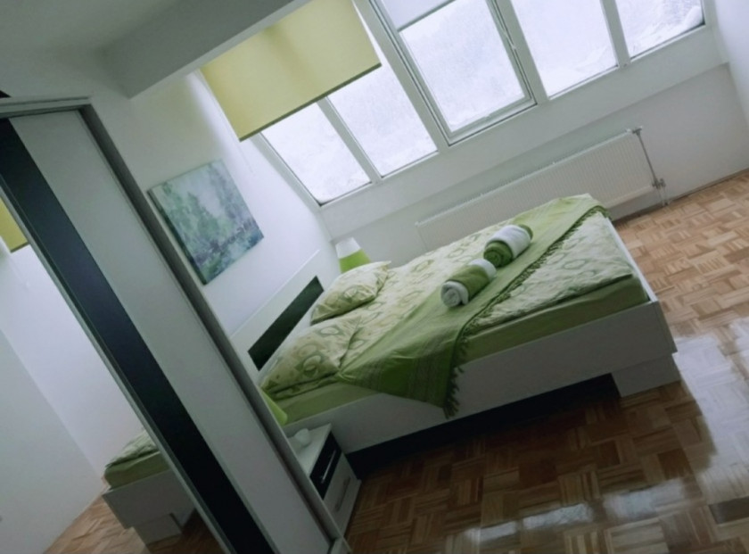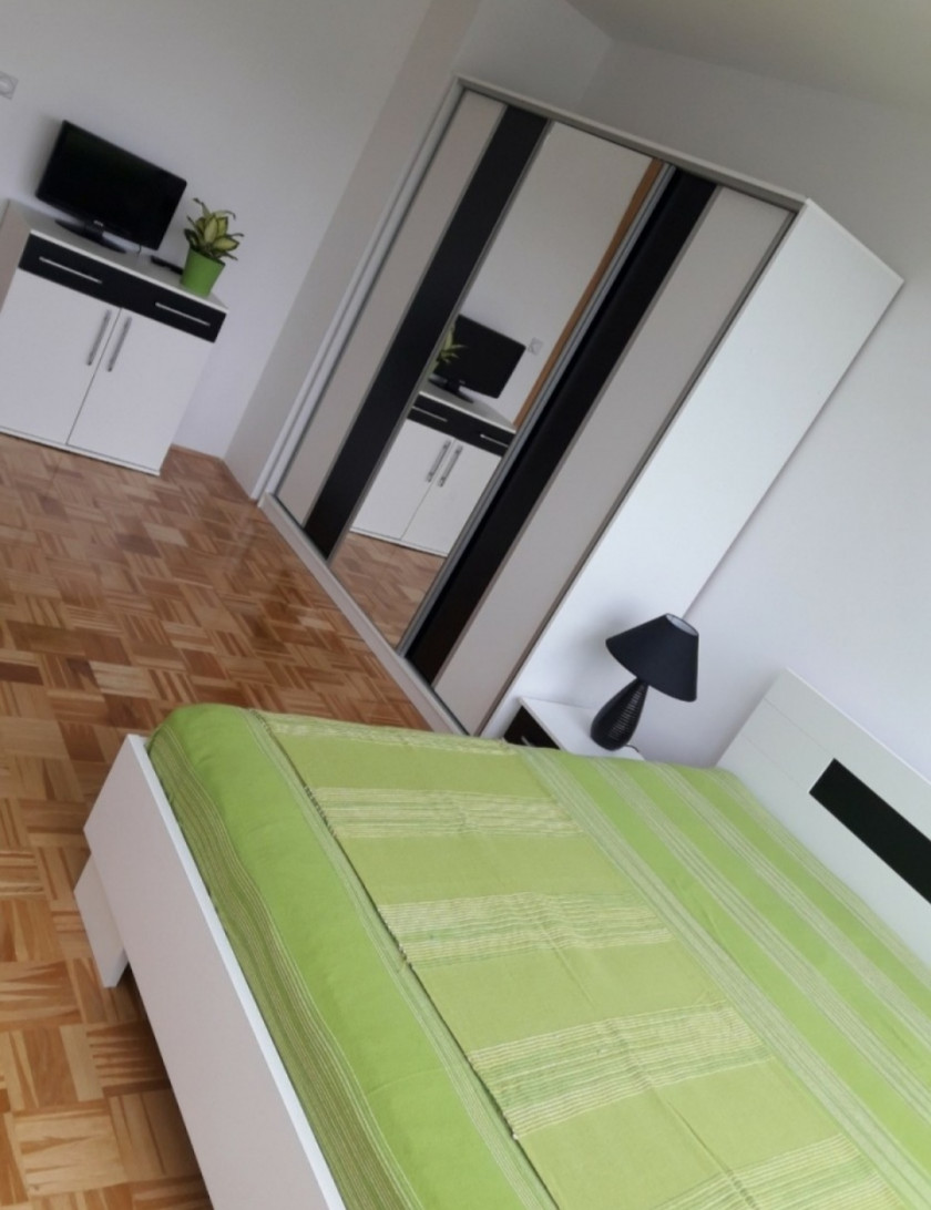 Кухиња је комплетно намјестена са комбинованим фризидером,уградбеном равном плоцом и пецницом, масином за судје,микроталасном пецницом, малим кухињским апаратима и посудјем. Купатило је опремљено са машином за прање и сушење веса марке Бош.