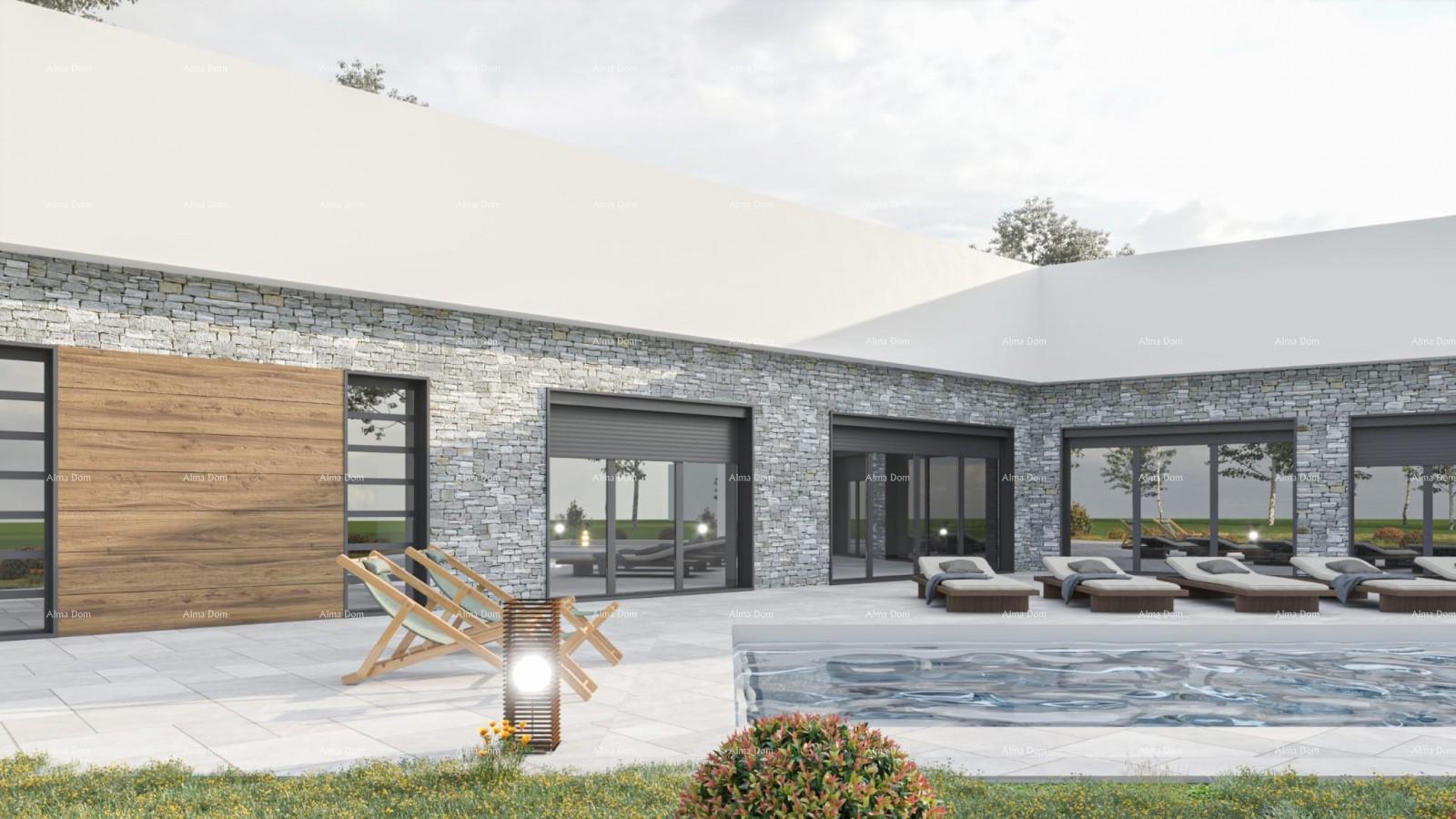 Projekt uključuje modernu obiteljsku kuću s 4 spavaće sobe i 4 kupaonice, dizajniranu za udoban i spokojan život. Prostrani dnevni boravak otvorenog koncepta (72 m²) ispunjen je svjetlom i povezuje se s veličanstvenim infinity grijanim bazenom (10x4 m, dubina 135 cm) te grijanom zimskom oazom s vanjskom kuhinjom, savršenom za opuštanje.