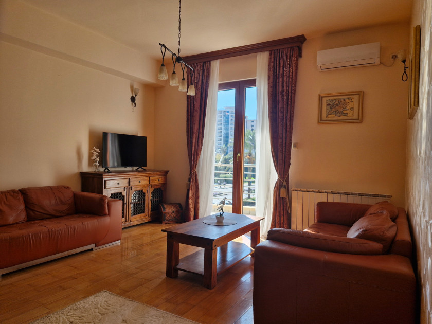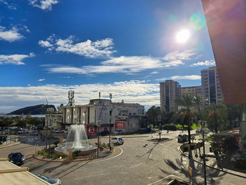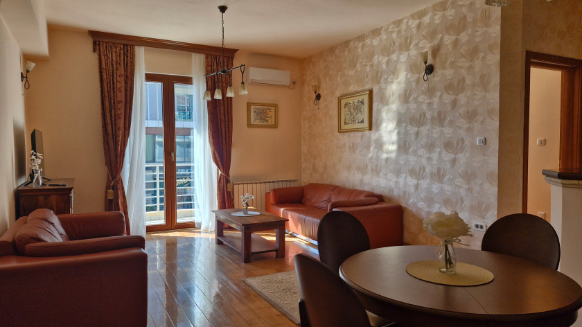 Opis: Dvosoban stan u centru Budve na samo 200 metara od mora. U blizini su supermarketi, restorani, kafići, Stari Grad. Posjeduje 2 kupatila, extra veliku kadu, 2 velike sobe i 2 zasebne terase.