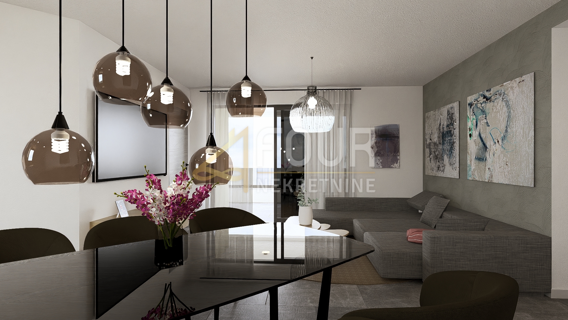 Unutarnji raspored zamišljen je kao trosoban stan s dnevnim boravkom, s naglaskom na udobnost i kvalitetu života. Opremljen je podnim grijanjem, klimom, PVC stolarijom s električnim roletama te nudi savršen spoj modernog dizajna i praktičnosti. Stanu pripadaju i dva vanjska parkirna mjesta, a udaljen je svega 300 metara od mora.
