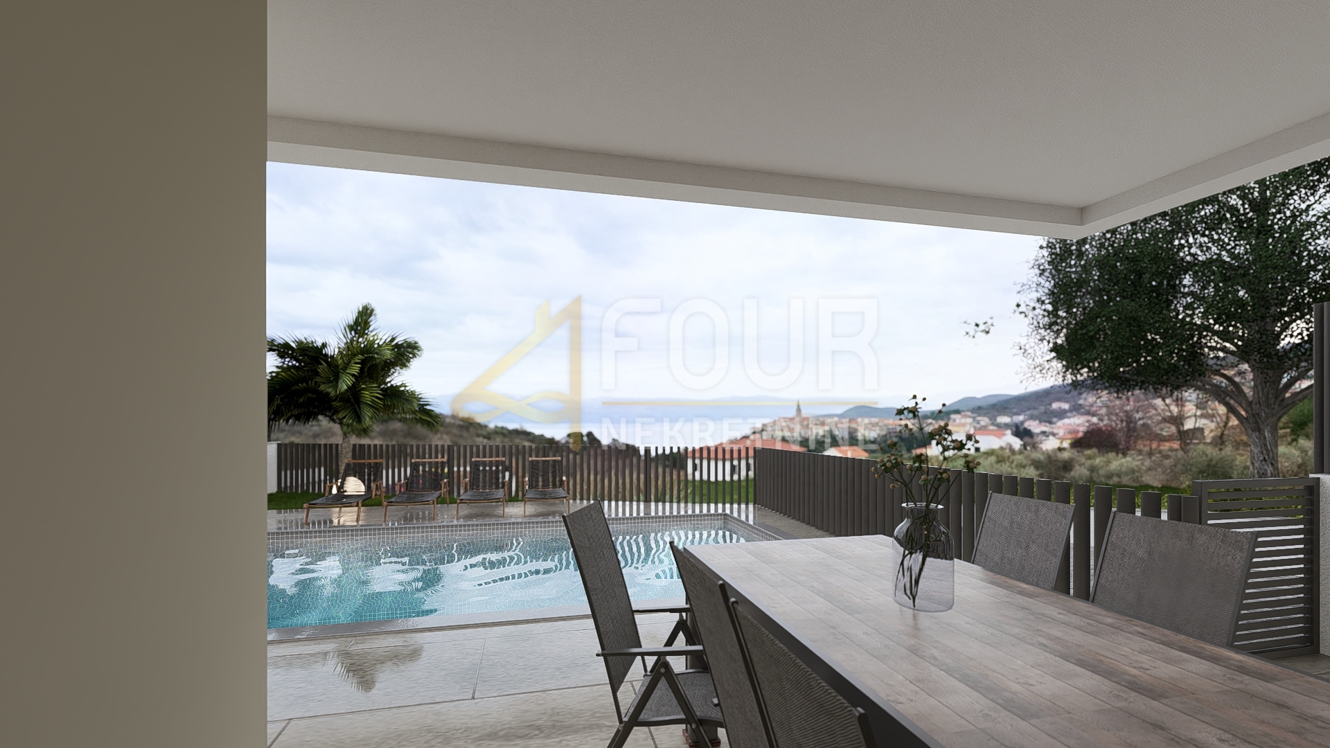 Smješten je u prizemlju te mu pripada vlastiti bazen i uređena okućnica od 40 m2. Ukupne je površine 107,86 m2, od čega je prostrana terasa od 15,71 m2 idealna za uživanje u pogledu na more.