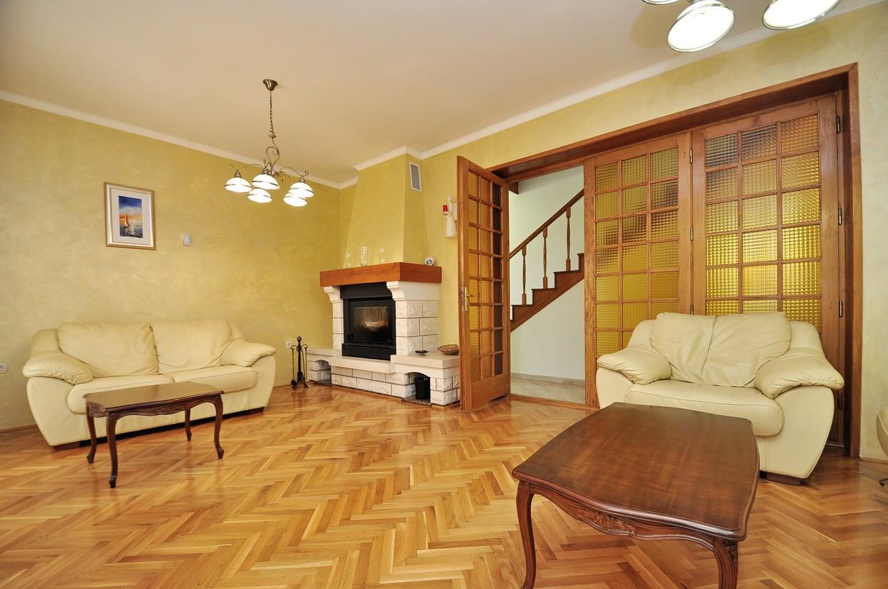 Prvi sprat: prostrani dnevni boravak sa kaminom, trpezarija i kuhinja, kupatilo, hodnik, tehnička prostorija i izlaz na terasu. Direktan pristup iz garaže.