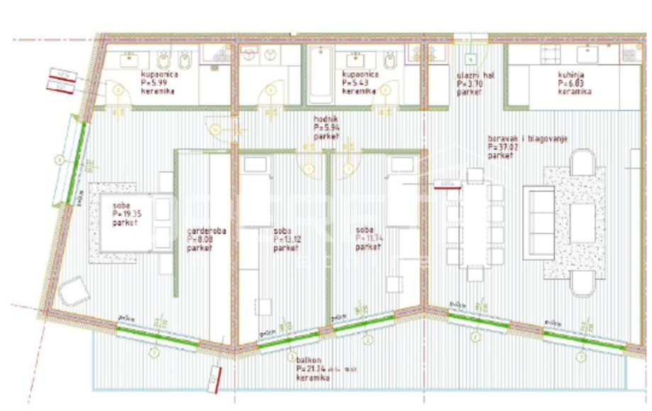 Opis: Istra, Poreč-stan izuzetne lokacije s liftom i pogledom na moreIz naše ponude izdvajamo se visokokvalitetan stan smješten na trećem katu moderne novogradnje opremljene liftom. Ukupna stambena površina iznosi 138,44 m². Stan se sastoji od ulaznog hodnika, otvorenog dnevnog prostora koji uključuje dnevni boravak s izlazom na terasu s prekrasnim pogledom na more, kuhinju s blagovaonicom, tri spavaće sobe od kojih svaka ima vlastiti balkon, dvije kupaonice, zasebnog WC-a, spremišta u podrumu zgrade površine 5,24 m² te dva garažna parkirna mjesta ukupne površine 30 m².Zgradu gradi domaći investitor, a svi stanovi bit će opremljeni najkvalitetnijim materijalima. Grijanje i hlađenje predviđeno je putem sustava klima jedinica u svakoj prostoriji, što osigurava visoku energetsku učinkovitost i ekonomičnost. Ugradnja PVC stolarije u boji bronce s podizno-kliznim balkonskim stijenama i električnim roletama predviđena je kao standard u svim spavaćim sobama.Fasada zgrade debljine 10 cm dodatno je opremljena toplinskom i zvučnom izolacijom....