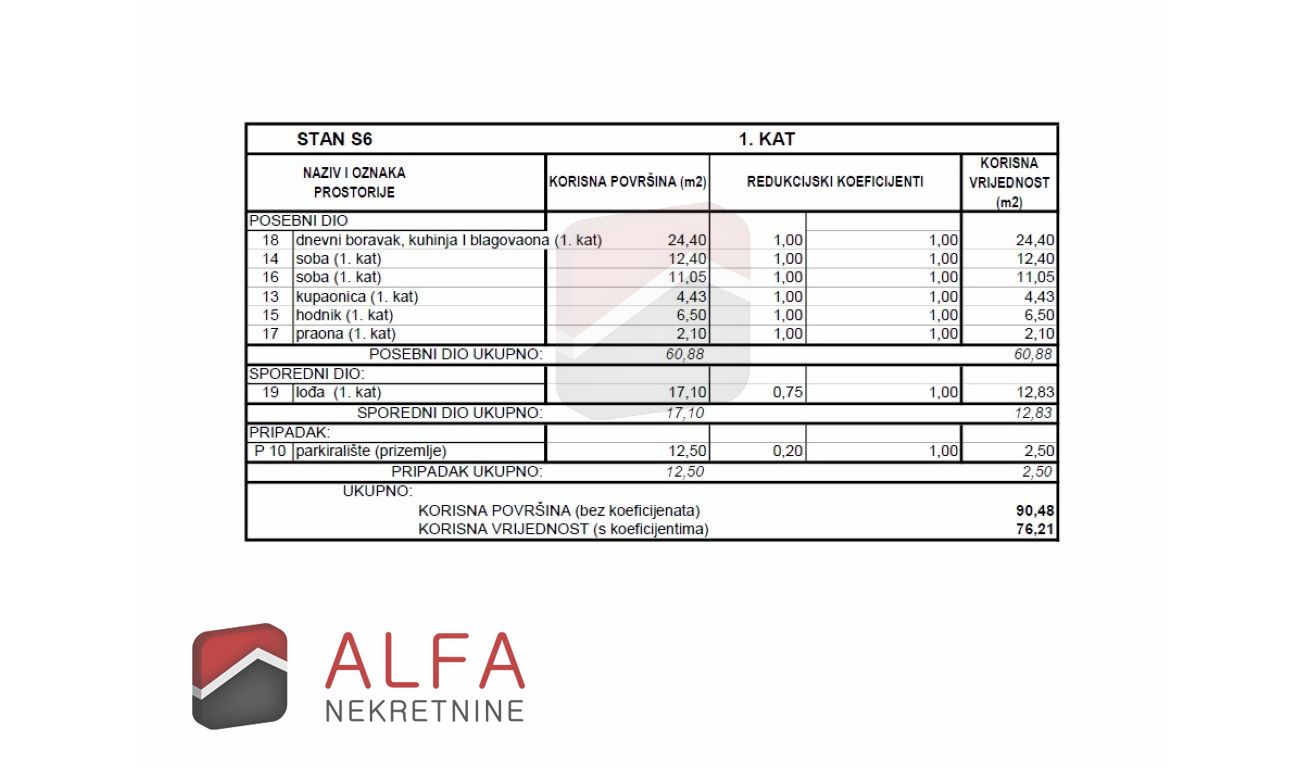 Stan S6 ima unutarnji stambeni prostor od 60,88 m2 + natkrivena terasa 17,10 m2 + jedno parkirno mjesto od 12,50 m2. Sveukupno sa obračunskim koeficijentima stan ima ukupnu korisnu vrijednost površine od 76,21 m2.