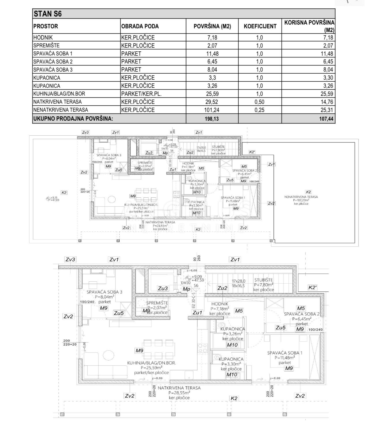 Prodaje se trosoban stan u novogradnji ukupne neto površine od 107.44 m2 (bruto površina 198.13 m2), položen na drugom katu manje stambeno poslovne zgrade. Stan se sastoji od ulaznog hodnika, kuhinje i blagovaonice s dnevnim boravkom, tri spavaće sobe, dvije kupaonice, spremište, jednu natkrivenu terasu i jednu nenatkrivenu terasu....
