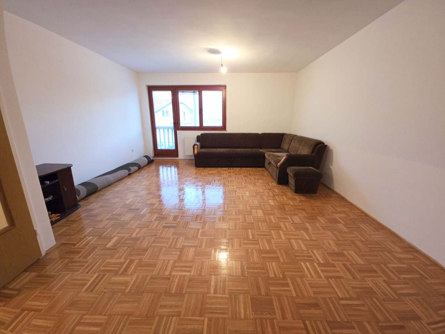 Sastoji se iz hodnika, dnevnog boravka sa kuhinjom, spavaće sobe, francuskog balkona i kupatila. Vanjska i unutrašnja stolarija je drvena. Pod je parket i keramika. Grijanje je etažno plinsko. Orijentacija stana je jugozapadna. Ulazna vrata su blindirana. Stan posjeduje i podrumsku prostoriju. Kuhinja može ostati u stanu.