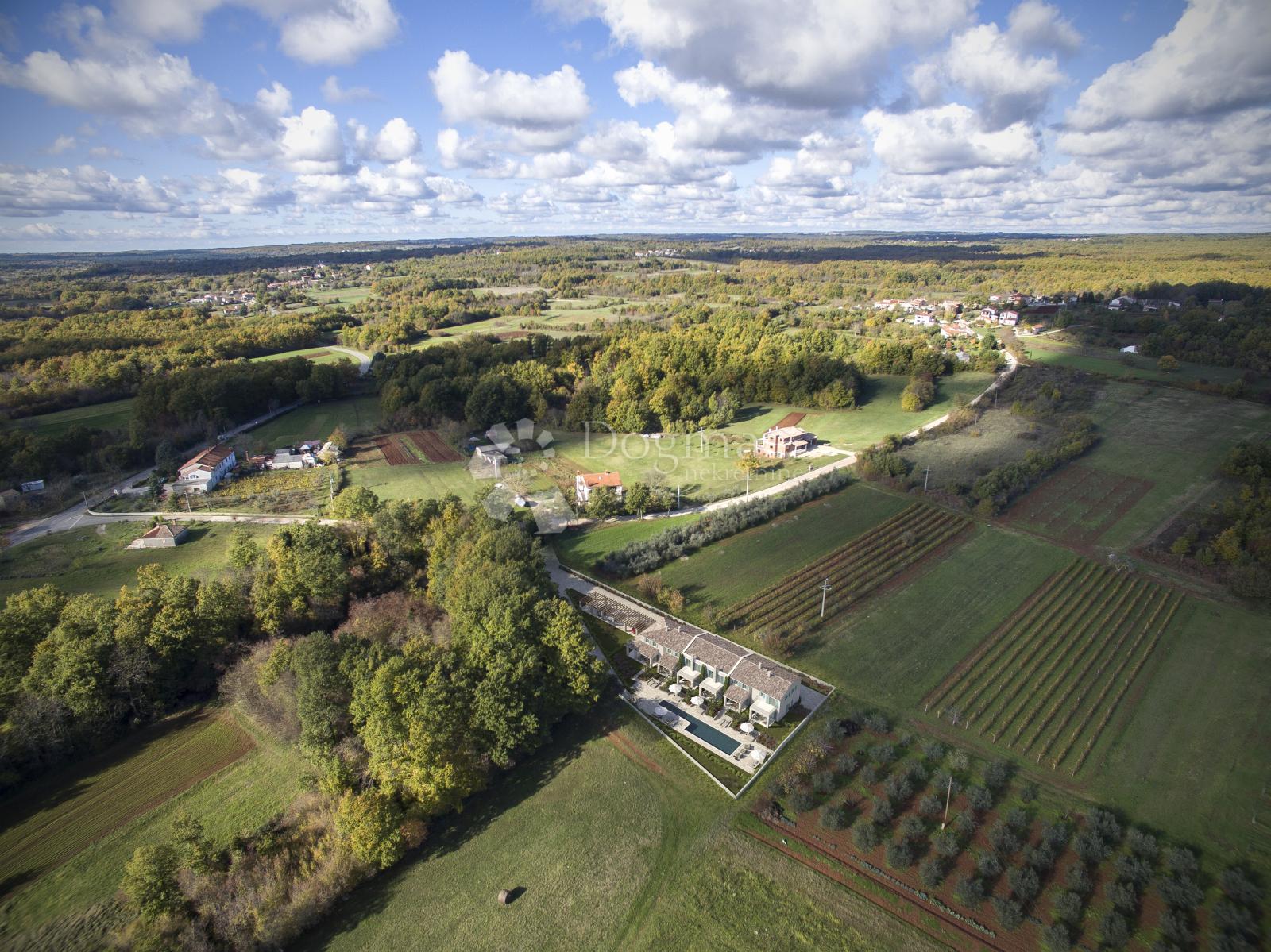 Na mirnoj lokaciji u zelenilu okolice Barbana, daleko od gradske vreve, prodaje se moderna kuća u nizu ukupne stambene površine 105 m² s prostranim privatnim vrtom od 110 m². Smještena u sklopu manjeg kompleksa od šest stambenih jedinica, ova nekretnina pruža savršenu ravnotežu privatnosti i zajedničkih sadržaja. Na parceli od 3.000 m² budući će vlasnici uživati u uređenom okolišu i velikom zajedničkom bazenu od čak 150 m².
