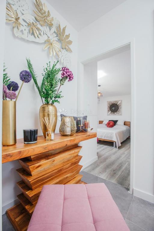 Kuća se prostire na četiri etaže, uz mogućnost nadogradnje dodatnog kata, a u njoj se nalazi šest moderno uređenih apartmana – od intimnih studija do prostranih trosobnih stanova.