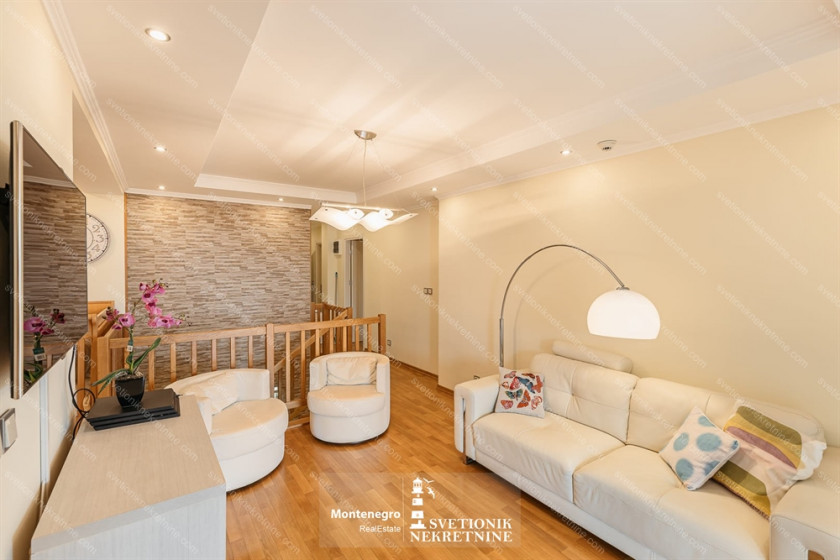 Stan se prostire na dva nivoa i sadrži dva dnevna boravka, šest spavaćih soba, dva kupatila, toalet, kuhinju sa trpezarijom, kao i terasu od 59m² sa panoramskim pogledom na more i đakuzijem.