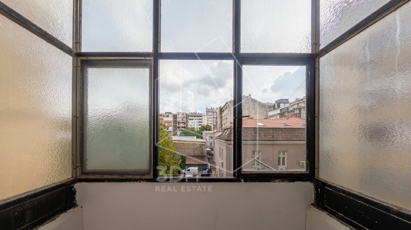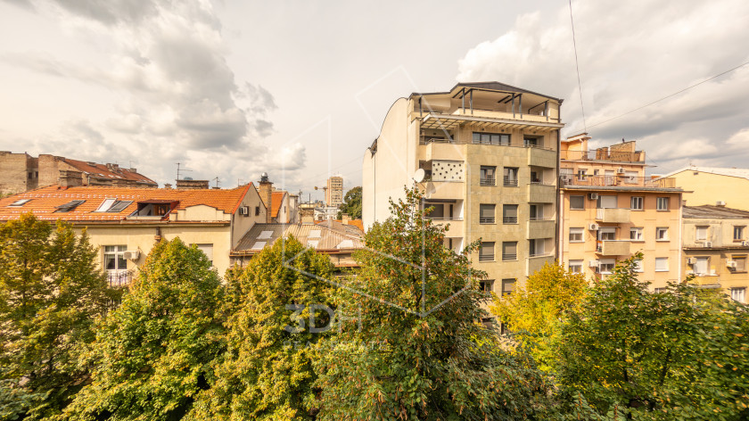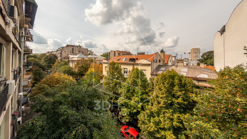 Stan je dvostrano orijentisan (severozapad–jugoistok), svetao i miran. Poseduje malu zastakljenu terasu okrenutu ka dvorišnoj strani, kojoj se pristupa iz kuhinje/trpezarije, kao i francuski balkon sa pogledom na krošnje glavne ulice, pristupačan iz dnevnog boravka. Zahvaljujući poziciji, u stanu gotovo da nema buke, iako je u samom centru grada.