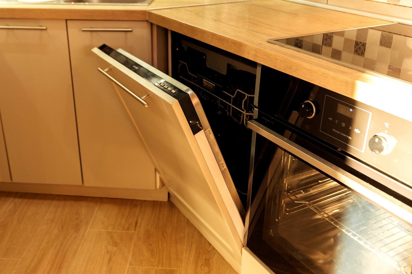 Custom-built kitchen with quality appliances: large fridge with freezer, dishwasher, induction cooktop, fan-assisted oven, and range hood