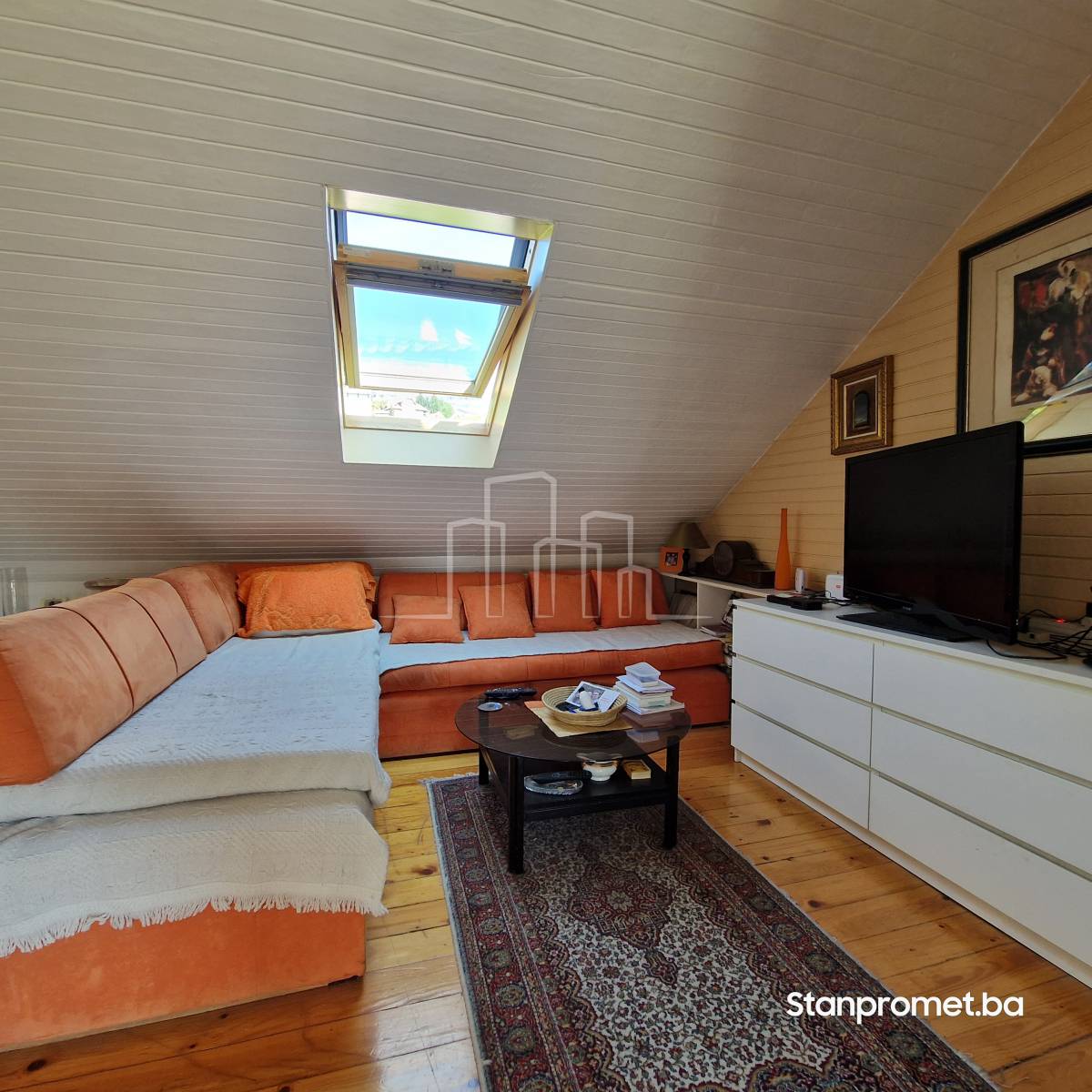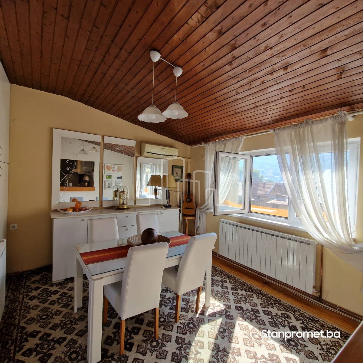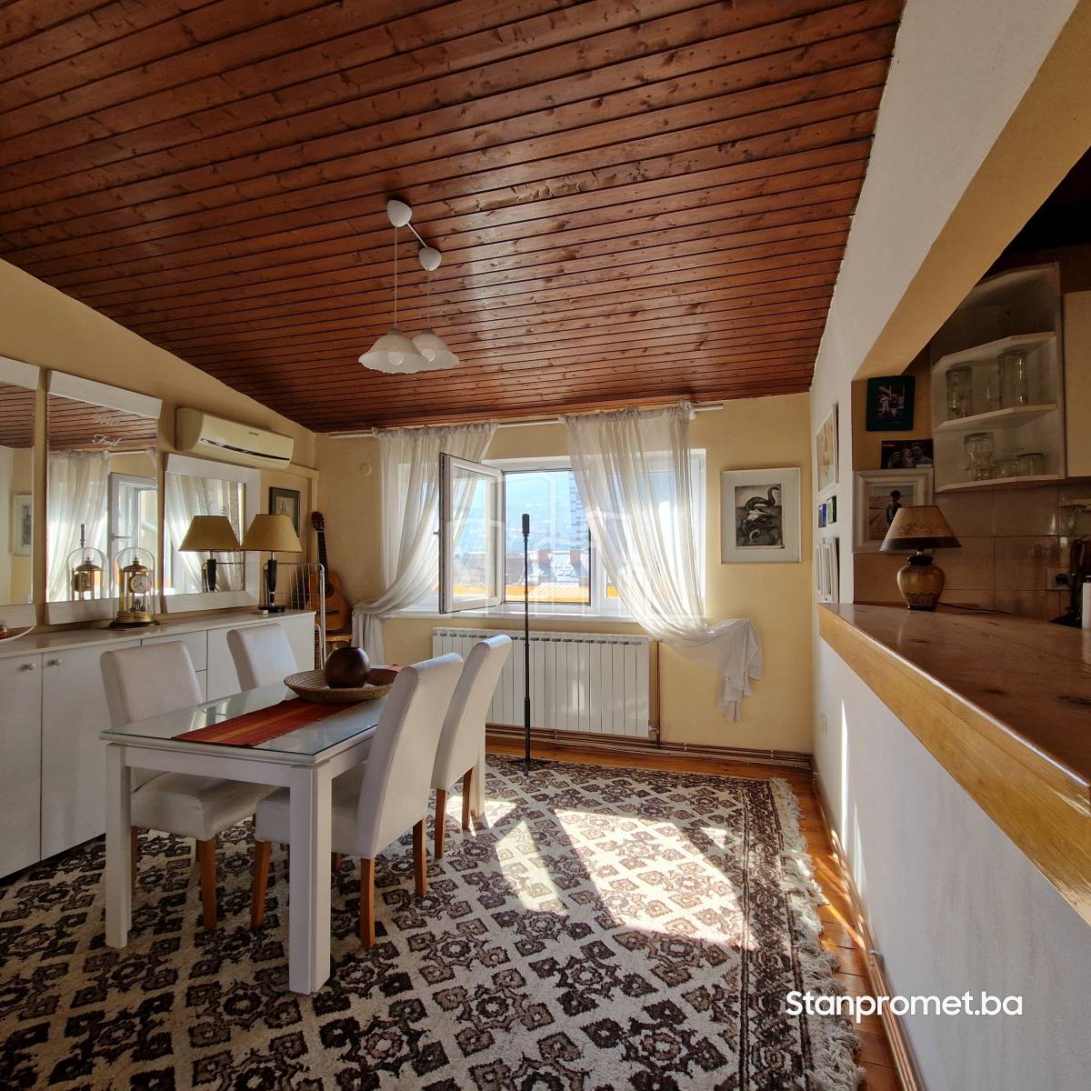 Nekretnina je smještena na 5. spratu zgrade bez lifta. Površinu 63 m2 čine dnevni boravak, trpezarija, spavaća soba, kuhinja, ulazni hodnik i kupatilo. Tu je i balkon zapadne orijentacije, te druga spavaća soba dobijena širenjem na tavanskim prostor. Stan je autentičan, djelimično u kosi ama, te u potpunosti renoviran.