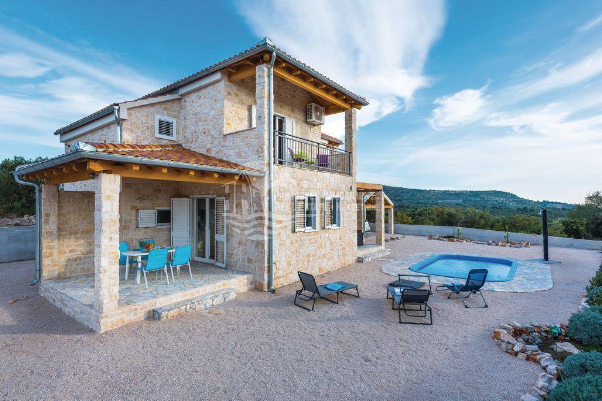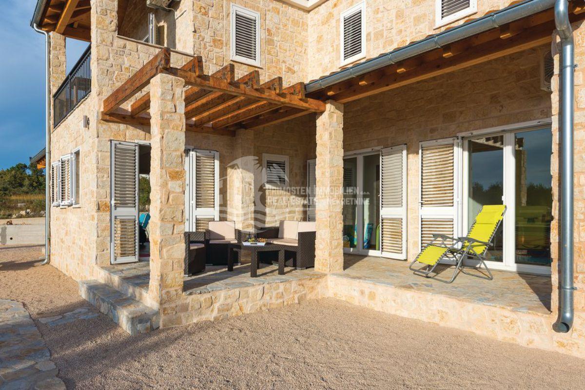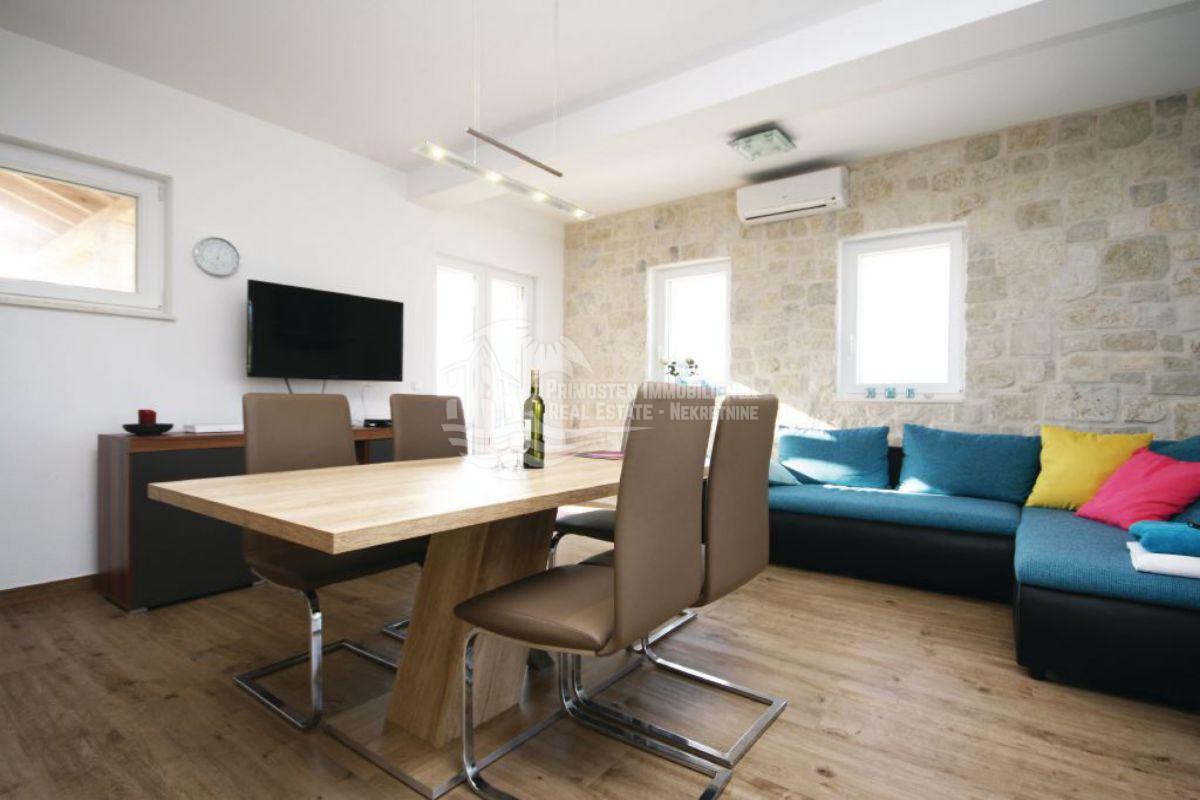 Opis: Ova dobro održavana finca nalazi se otprilike 3 km od centra i plaže Primoštena i nudi dvije odvojene, potpuno namještene jedinice s otprilike 197,5 m² stambenog prostora – idealno za obitelji ili za najam. Kuća ima ukupno 4 spavaće sobe, 2 kupaonice, dvije kuhinje s blagovaonicom (svaka s klima uređajem), kamin, nekoliko natkrivenih terasa i balkona te podrum. Mediteranski elementi poput prirodnih kamenih zidova i drvenih greda stvaraju ugodnu atmosferu.