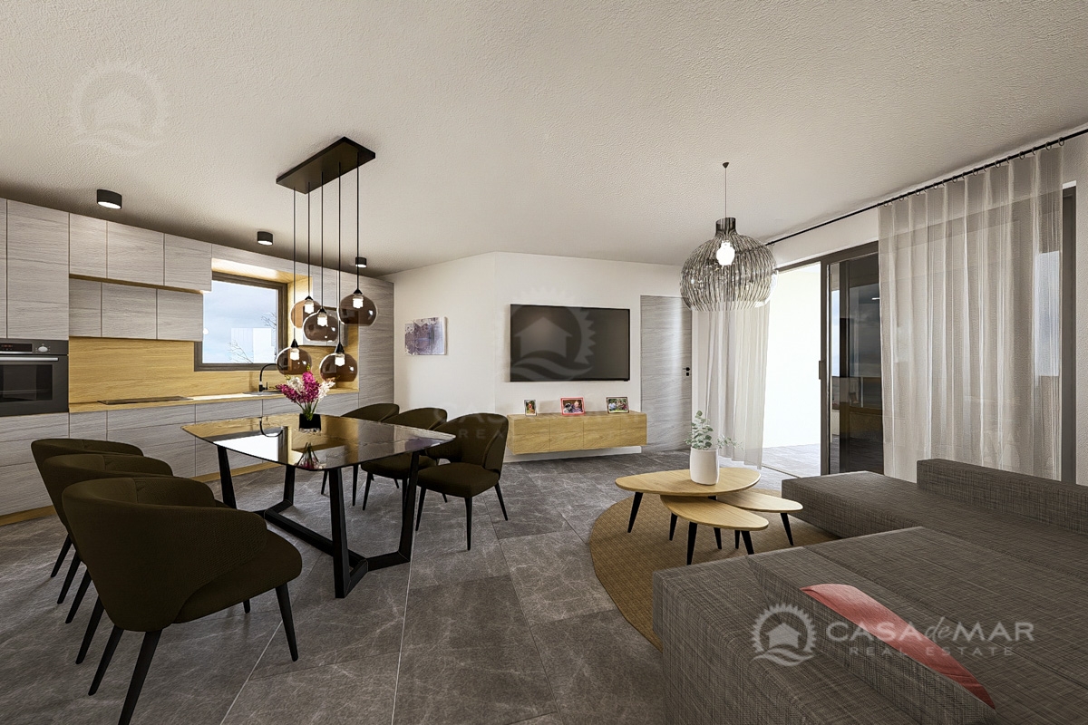 Apartman se prostire na 101 m² stambene površine i nudi funkcionalan raspored: prostrani open space dnevni boravak s kuhinjom i blagovaonicom, tri udobne spavaće sobe, dvije kupaonice, toalet i spremište. Iz dnevnog boravka se pristupa natkrivenoj terasi s koje se pruža predivan otvoreni pogled na more, koja je idealno mjesto za opuštanje i uživanje.