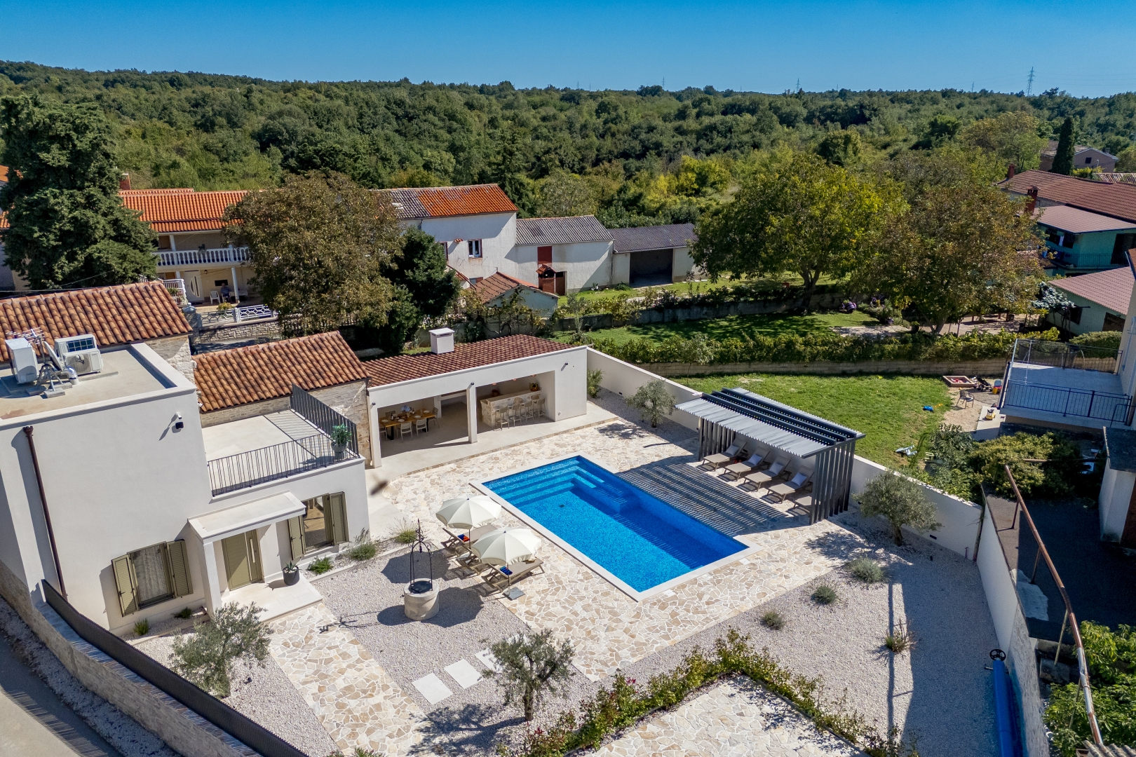 Opis (Engleski): For sale: Modern villa in Kanfanar near Rovinj!This elegant villa is located in a peaceful village just a 15-minute drive from Rovinj, one of the most desirable destinations on the Istrian coast. The property sits on a 640 m² plot, with a living area of 130 m² spread over the ground floor and first floor.The ground floor features an entrance hall, a spacious open-plan living room with kitchen and dining area, one bedroom with en-suite bathroom, and a guest toilet. Upstairs are two additional bedrooms, each with its own bathroom and access to a balcony.The villa is equipped with underfloor heating powered by a heat pump, and every room has air conditioning for comfort during the summer months. All windows and doors are made of aluminum with triple glazing, ensuring excellent energy efficiency.The beautifully landscaped garden of 526 m² offers a heated saltwater swimming pool measuring 9 x 4.5 m, a sun deck, a summer kitchen with barbecue, and several parking spaces....