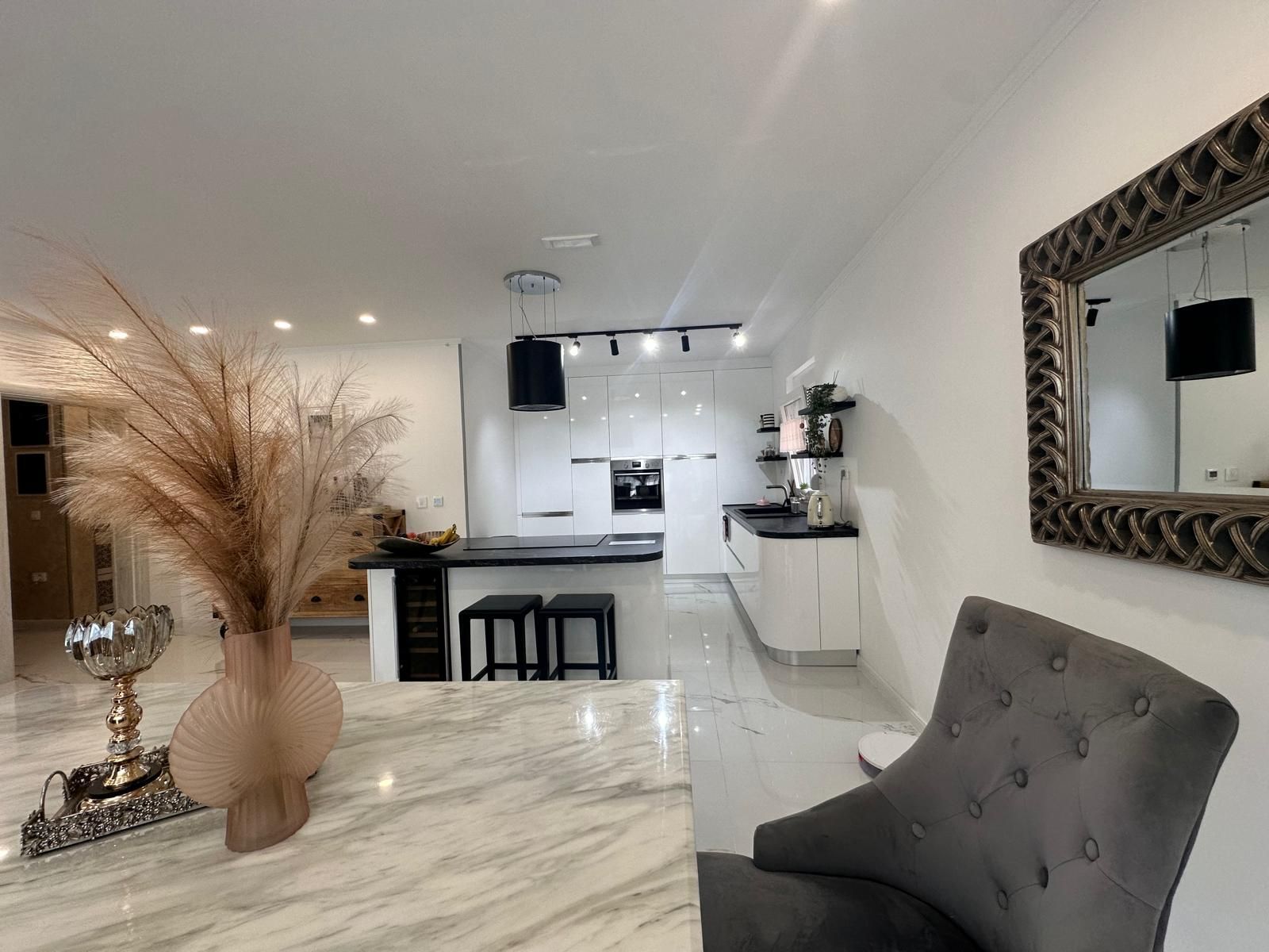 Prizemlje je dizajnirano kao otvoreni prostor koji čine dnevni boravak, kuhinja s ostrvom i trpezarijom, odakle se pruža direktan izlaz na dvorište s pogledom na more. Na istom nivou nalazi se i prostrano kupatilo s tuš kabinom, kao i vešernica/ostava. Elegantno stepenište izrađeno od granita vodi na sprat, gdje se iz hodnika ulazi u tri spavaće sobe, veliko kupatilo i dva garderobera.