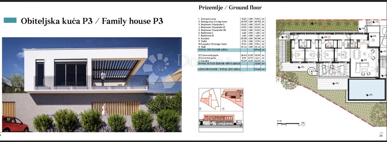 U ponudi je luksuzna, moderno opremljena vila P3 smještena u ekskluzivnom stambenom kompleksu u blizini Primoštena. Prostire se na dvije etaže s ukupnom korisnom površinom od 392 m², a njezin dizajn kombinira vrhunske estetske i funkcionalne standarde, nudeći potpunu privatnost i udobnost.