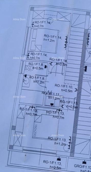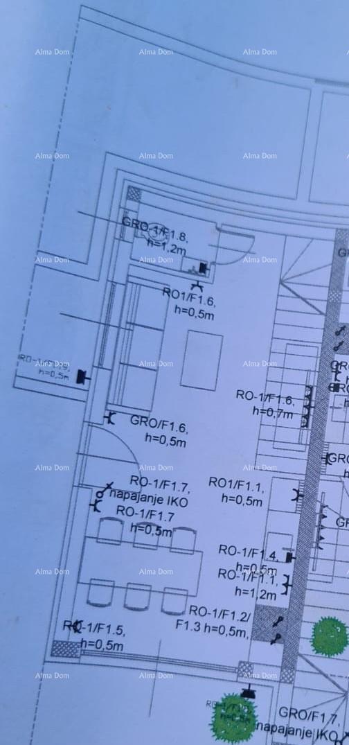 Prizemlje: ulazni prostor sa stubištem, WC, dnevni boravak s kuhinjom i blagovaonom.