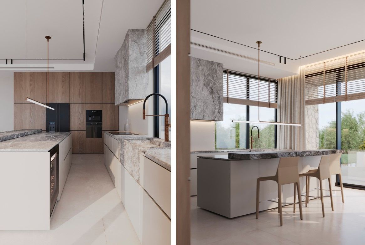 Vila je projektovana prema najvišim standardima moderne gradnje, uz korišćenje visokokvalitetnih materijala i dizajnerskih završnih obrada. Unutrašnjost se sastoji od tri prostrane spavaće sobe, svaka sa sopstvenim kupatilom, prostranog dnevnog boravka sa kaminom na drva, kuhinje i trpezarije, kupatila za goste i tehničke prostorije. Garaža sa kapacitetom za tri automobila povezana je liftom sa stambenim spratom, pružajući dodatnu udobnost.
