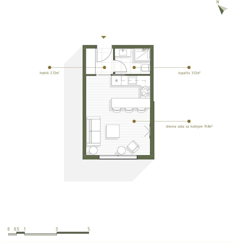 Opis: Prodaje se garsonjera u izgradnji ukupne stambene površine 26m2 u novom i modernom kompleksu na Zabjelu.
