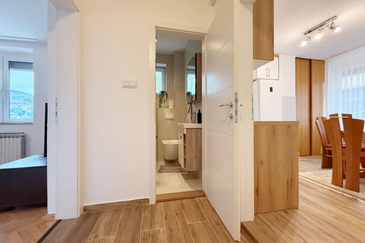 Opis: Iznajmljujemo tek renoviran i lijepo opremljen dvosoban stan površine 47m2. Stan se nalazi na samom prelazu iz naselja Koševsko brdo u naselje Ciglane, u objektu u kojem je smješten market „Hoše Komerc“. Sastoji se od dnevnog boravka, spavaće osbe, komforne kuhinje sa trpezarijom, kupatila i predsoblja. Tokom 2025 godine je potpuno renoviran i opremljen novim namještajem. Obzirom na dvostranu orjentaciju i svijetle tonove korištene prilikom uređenja, vrlo je svijetao i prozračan.