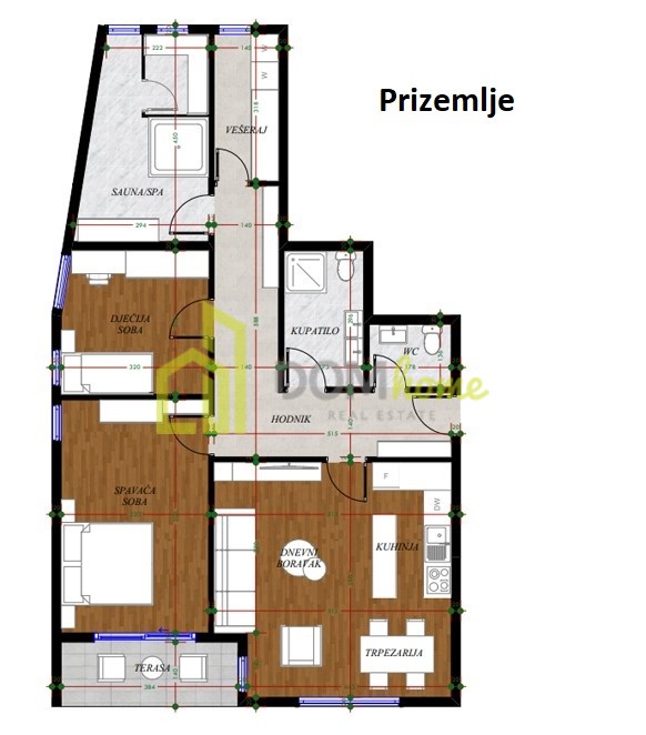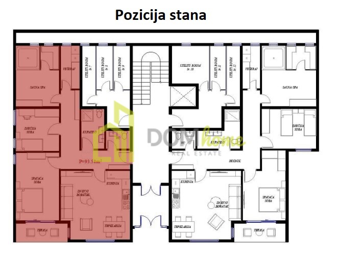 Opis: Struktura stana: ulazni hodnik, dnevni boravak, kuhinja, trpezarija, tri spavaće sobe, kupatilo, toalet, vešeraj, sauna-spa i terasa.