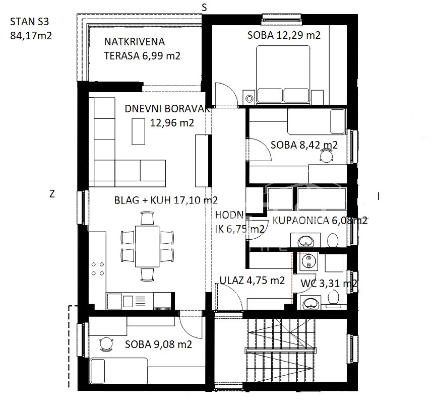 Opis: PRODAJA, STAN, VELIKA GORICA, 101m2Komforni 4-sobni stan S3 na 1.katu moderne stambene zgrade s 4 stana (priprema izgradnje u tijeku). Stan neto unutarnje površine 80.68 m2 uključuje ulazni prostor i hodnik, prostrani dnevni boravak s blagovaonicom i kuhinjom, 3 spavaće sobe, kupaonicu s kadom i tušem te mali dodatni toalet u kojem se nalazi dizalica topline. Efektan dio stana je natkrivena terasa sjeverozapadne orijentacije površine 6.99 m2. Stan se prodaje prema izboru i potrebama kupca u dvije opcije:1. Stan površine 80.68 m2, natkrivena terasa površine 6.99 m2 i privatna garaža s 2 parkirna mjesta površine 33.64 m2 u razini prizemlja (prema izračunu s koeficijentima stan, terasa i garaža imaju ukupno 101.00 m2). 2. Stan površine 80.68 m2, natkrivena terasa površine 6.99 m2, spremište površine 5.14 m2, te 2 vanjska parkirna mjesta površine 25 m2 (prema izračunu s koeficijentima stan, terasa, spremište i parkinzi imaju ukupno 93.03 m2)....