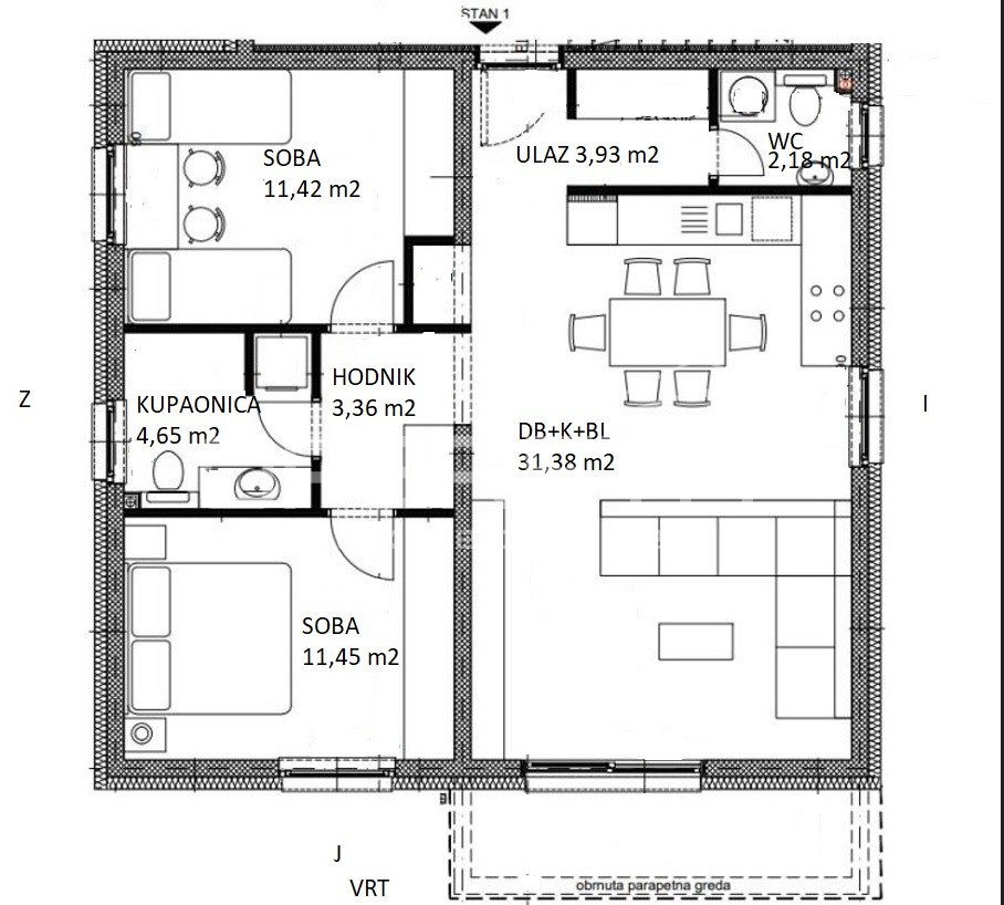 Opis: PRODAJA, STAN, VELIKA GORICA 93,07m2Trosoban stan (S1) s vrtom u mirnoj zoni Velike Gorice. Stan se nalazi u prizemlju moderne novogradnje s 4 stana (priprema izgradnje u tijeku), očekivani rok useljenja je proljeće 2027.Stan neto unutarnje površine 68,25 m2 uključuje ulazni prostor i hodnik, prostrani dnevni boravak s blagovaonicom i kuhinjom, 2 spavaće sobe idealnih dimenzija, kupaonic, te mali dodatni toalet u kojem se nalazi dizalica topline. Efektan dio stana je prostrani vrt površine cca 80 m2 južne orijentacije.Stan se prodaje prema izboru i potrebama kupca u dvije opcije:1. Stan površine 68.25 m2, vrt površine 80 m2 i privatna garaža s 2 parkirna mjesta površine 33.64 m2 u razini prizemlja = 278.070 € (prema izračunu s koeficijentima stan, vrt i garaža imaju ukupno 93,07 m2).2. Stan površine 68,25 m2, vrt površine 80 m2, spremište površine 5,14m2, te 2 vanjska parkirna mjesta površine 25 m2 = 254.449 € (prema izračunu s koeficijentima stan, vrt, spremište i parkinzi imaju ukupno 85,10 m2)....