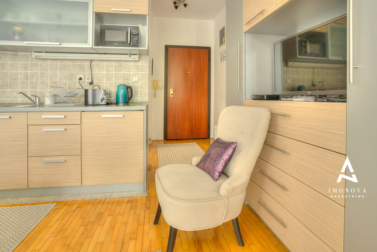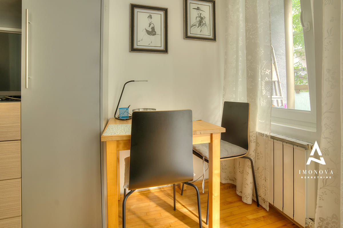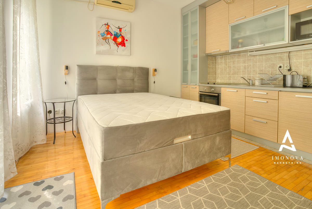 Ovaj moderno uređen studio na Vračaru je kompletno opremljen i odmah spreman za useljenje. U stanu se nalaze francuski ležaj, kvalitetni ugradni plakari, kuhinja sa ugradnim uređajima, kao i kupatilo sa tuš kabinom i veš mašinom. Prostor je svetao i funkcionalno organizovan, što ga čini pogodnim za jednu osobu ili par.