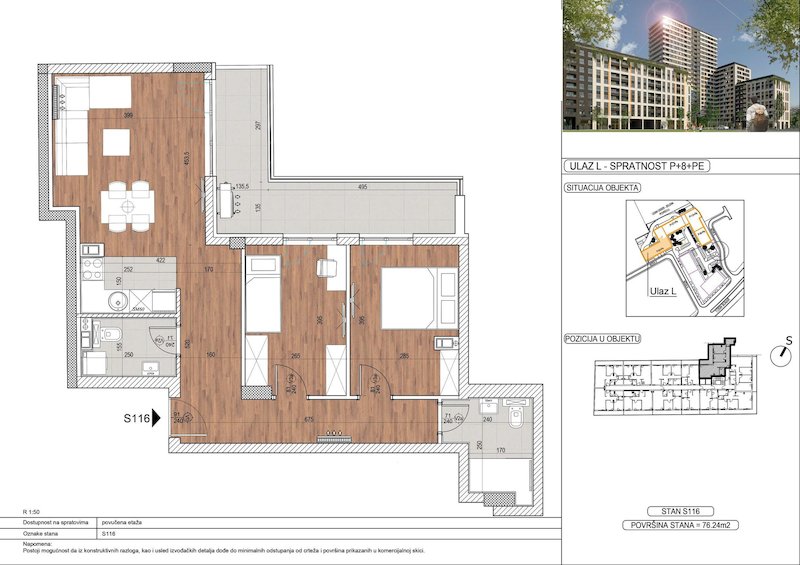 Opis: Prodaje se trosoban stan površine 76,24 m² u modernoj stambenoj zoni