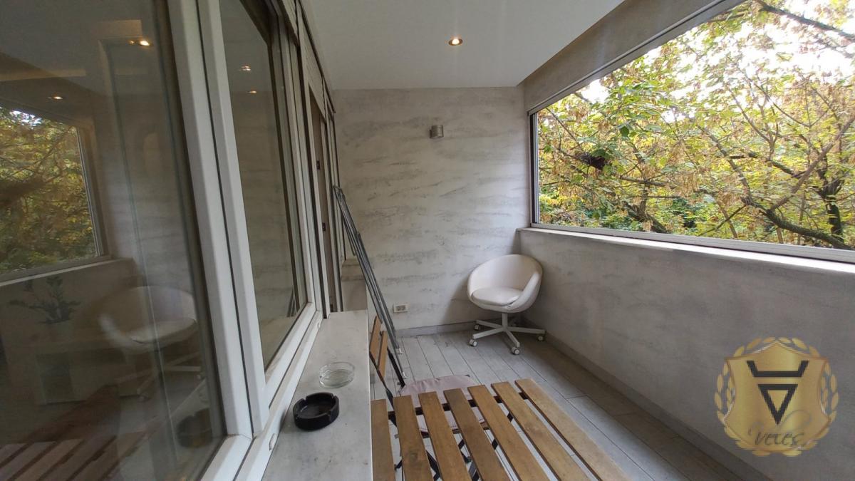 The spacious terrace offers a beautiful view of a quiet, green park....
