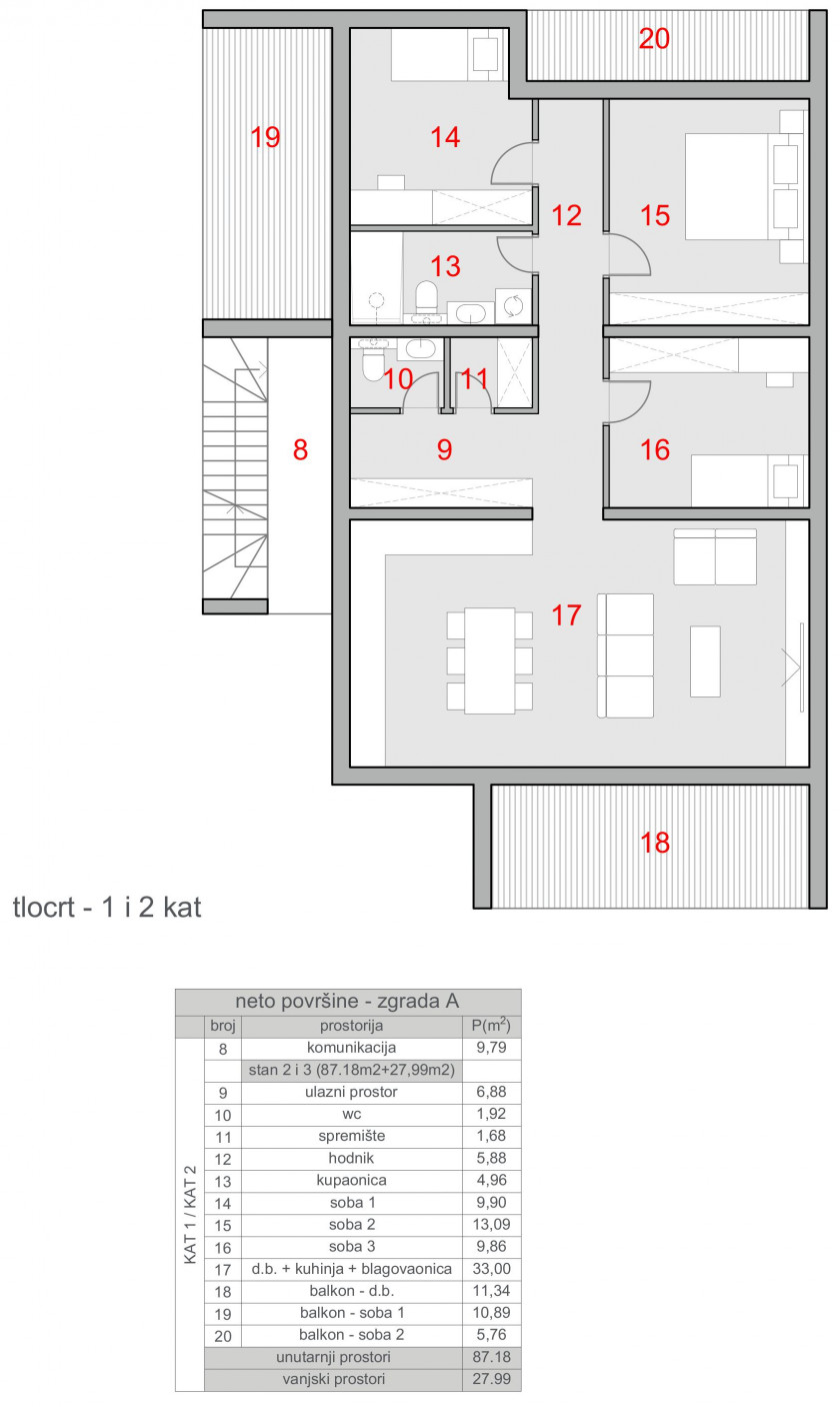➔ Ukupna površina: 99,74 m² (87,18 m² unutarnji prostor + 27,99 m² vanjski prostori)