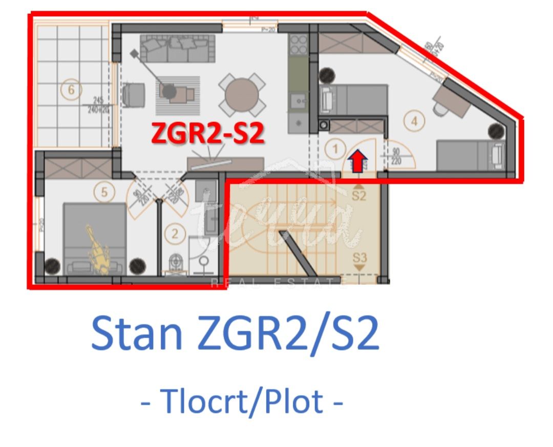 Stan se sastoji od:open space dnevnog boravka,kuhinje i blagovaone,dvije spavaće sobe,kupatilo i natkrivena terasa.