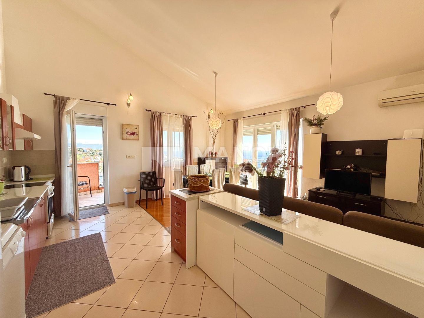 Stan se sastoji od četiri spavaće sobe, prostranog dnevnog boravka s izlazom na balkon, kuhinje s blagovaonicom, dvije kupaonice te dodatnih prostorija za odlaganje. Balkon nudi prekrasan, otvoren pogled na more i cijeli Kvarnerski zaljev – idealno mjesto za jutarnju kavu ili večernje opuštanje.