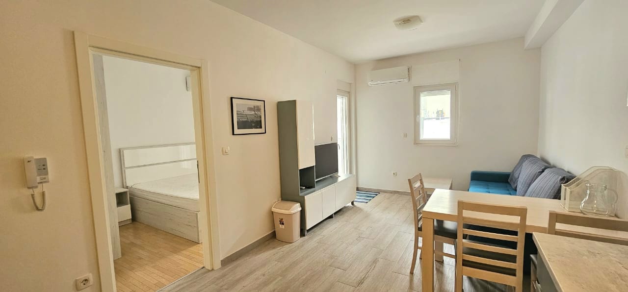 Opis: Ovaj jednosobni stan ima 39m2. Namješten je. Ima podrum. Ima veliku terasu. 2 špageta.