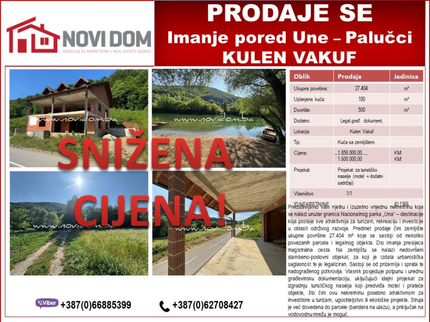 Opis: Predstavljamo vam rijetku i izuzetno vrijednu nekretninu koja se nalazi unutar granica Nacionalnog parka „Una“ – destinacije koja postaje sve atraktivnija za turizam, rekreaciju i investicije u oblasti održivog razvoja. Predmet prodaje čini zemljište ukupne površine 27.404 m² koje se sastoji od nekoliko povezanih parcela i legalnog objekta. Dio imanja presijeca magistralna cesta. Na zemljištu se nalazi nedovršeni stambeno-poslovni objekat, za koji je izdata urbanistička saglasnost te je legaliziran. Sastoji se od prizemlja i sprata te nadograđenog potkrovlja. Vlasnik posjeduje potpunu i urednu građevinsku dokumentaciju, uključujući idejni projekat za izgradnju turističkog naselja koji predviđa motel i prateće objekte, što čini ovu nekretninu posebno atraktivnom za investitore u turizam, ugostiteljstvo ili ekološke projekte. Struja je već dovedena do parcele (bandera na ulazu), a priključak na vodovodnu mrežu je moguć.