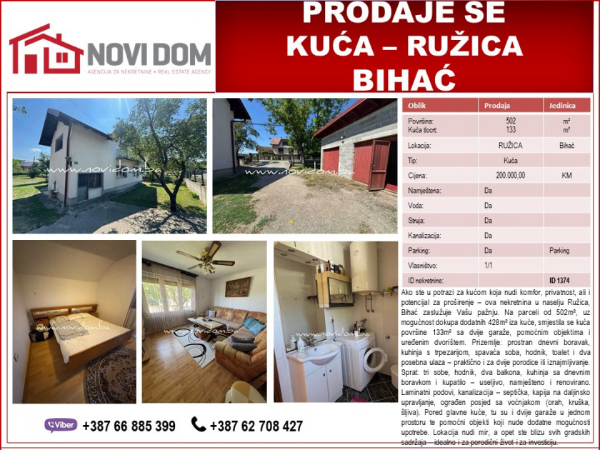 Opis: Ako ste u potrazi za kućom koja nudi komfor, privatnost, ali i potencijal za proširenje – ova nekretnina u naselju Ružica, Bihać zaslužuje Vašu pažnju. Na parceli od 502m², uz mogućnost dokupa dodatnih 428m² iza kuće, smjestila se kuća površine 133m² sa dvije garaže, pomoćnim objektima i uređenim dvorištem. Prizemlje: prostran dnevni boravak, kuhinja s trpezarijom, spavaća soba, hodnik, toalet i dva posebna ulaza – praktično i za dvije porodice ili iznajmljivanje. Sprat: tri sobe, hodnik, dva balkona, kuhinja sa dnevnim boravkom i kupatilo – useljivo, namješteno i renovirano. Laminatni podovi, kanalizacija – septička, kapija na daljinsko upravljanje, ograđen posjed sa voćnjakom (orah, kruška, šljiva). Pored glavne kuće, tu su i dvije garaže u jednom prostoru te pomoćni objekti koji nude dodatne mogućnosti upotrebe. Lokacija nudi mir, a opet ste blizu svih gradskih sadržaja – idealno i za porodični život i za investiciju.