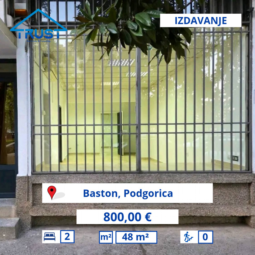Vrsta: Poslovni Prostor za Duži Najam Područje: Podgorica Lokacija: Baston Cijena: €800 Spavaćih Soba: 2 Kupatila: 1 Stambena Površina: 48 m2 Klima Uređaj Čuvajte se prevara: NE vršite IBAN uplate