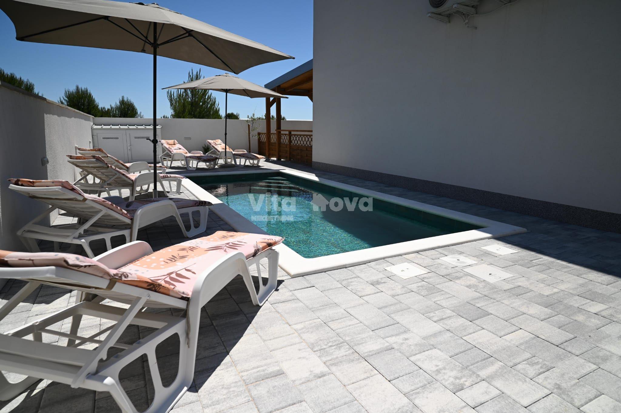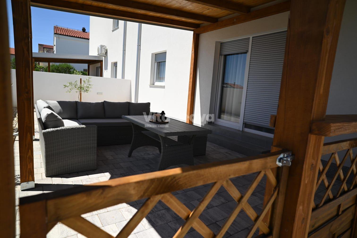 Iz dnevnog boravka izlazi se na terasu, savršenu za opuštanje i druženje u toplim večerima. Terasa je natkrivena nadstrešnicom koja pruža zaštitu od sunca i laganu hladovinu, što ju čini idealnim prostorom za boravak tijekom cijelog dana. U produžetku terase je bazen, savršen za osvježenje i potpuni užitak u ljetnim mjesecima. Ispred ulaza u kuću je više parkirnih mjesta.