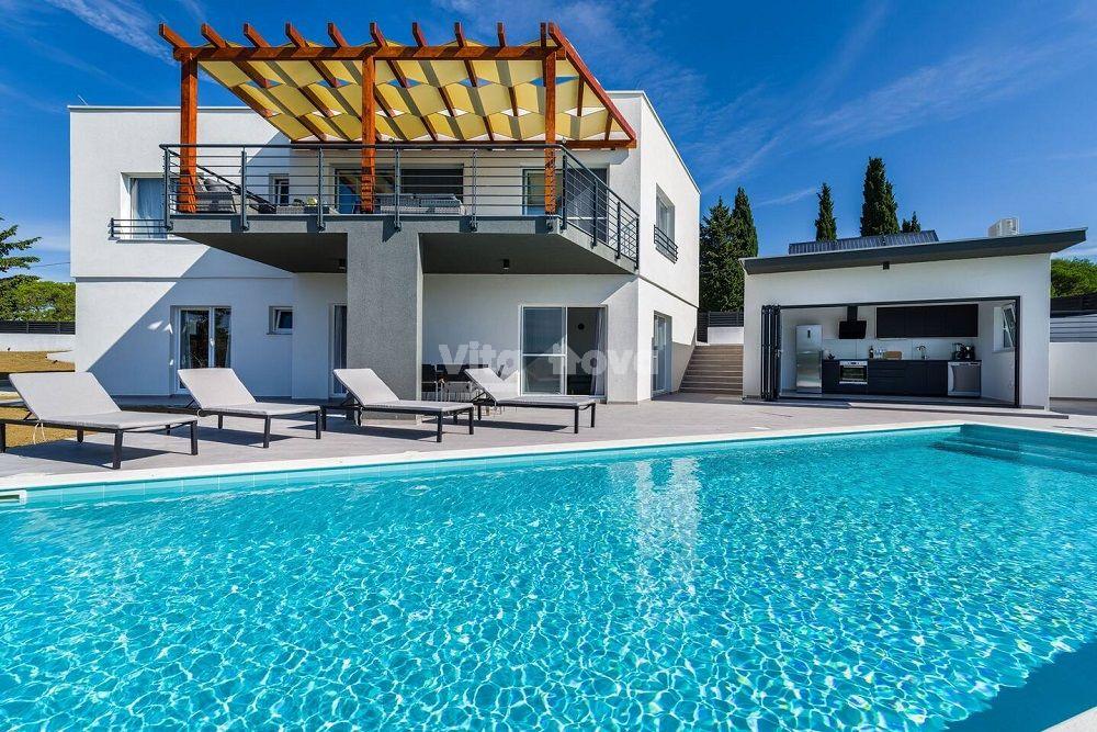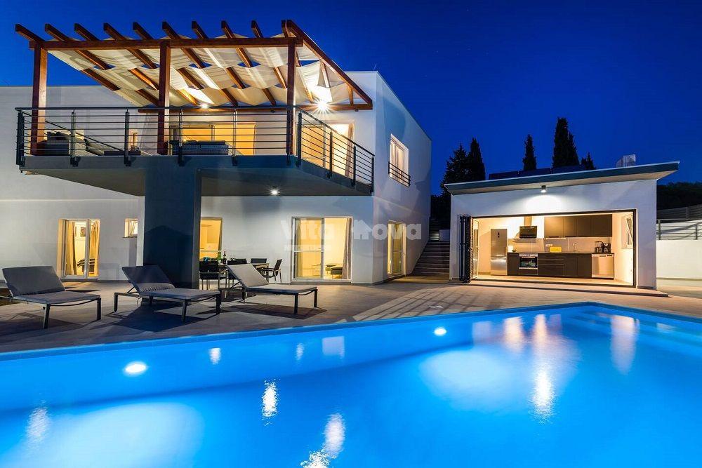 Opis: Prodaje se novogradnja u Diklu s bazenom i pogledom na more i otoke.Kuća na gornjoj etaži ima kuhinju, blagovaonicu, dnevni boravak, dvije spavaće sobe s kupaonicama i prostrani balkon s kojeg se pruža prekrasan pogled na more. U prizemlju se nalaze dvije spavaće sobe s kupaonicama, zaseban wc i dnevni boravak. U dvorištu se nalazi bazen od 42 m² s hidromasažom, te ljetna kuhinja s roštiljem. U dvorištu se nalazi jedno parkirno mjesto , a ispred kuće nekoliko.Villa se prodaje kompletno opremljena. Ima uhodani posao turističkog najma.Kontakt: info@vitanovanekretnine.hr, 091/7677-657