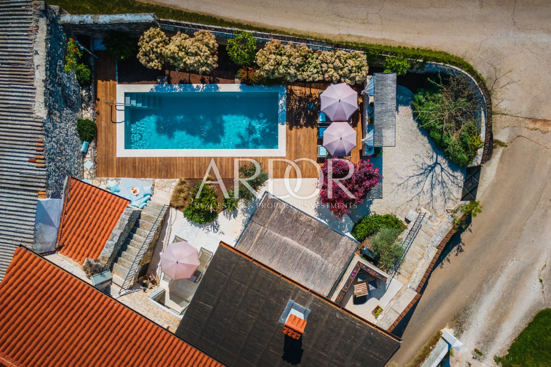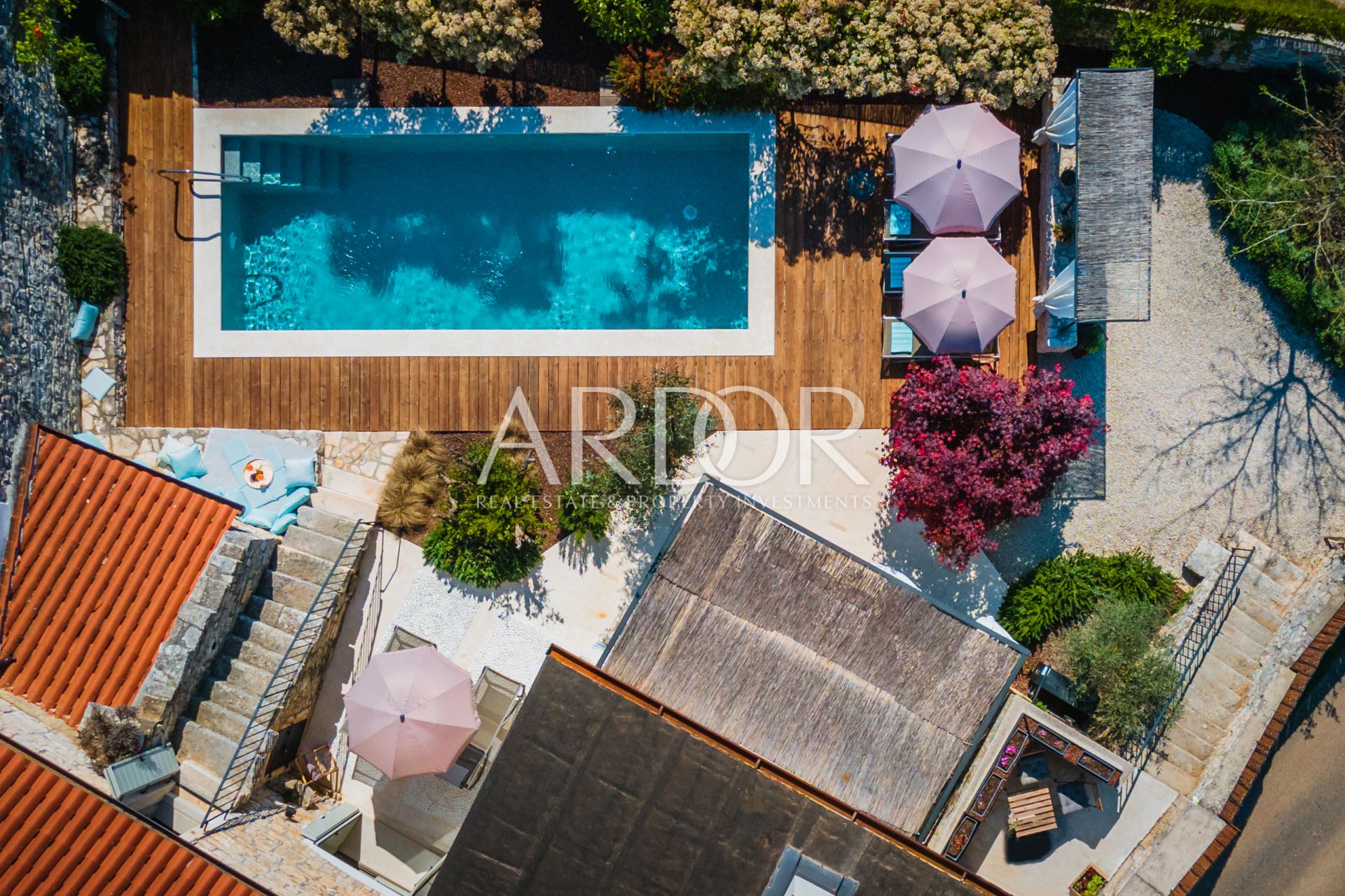 Na vanjskom prostoru nalazi se privatni grijani bazen sa slanom vodom površine 23 m², opremljen ležaljkama, suncobranima i vanjskim tušem. Natkrivena terasa s roštiljem, vanjskom kuhinjom i kamenim lounge kutkom savršena je za objedovanje na otvorenom. Ograđeni vrt s raskošnim mediteranskim biljem pruža privatnost i sigurno okruženje za obitelj....
