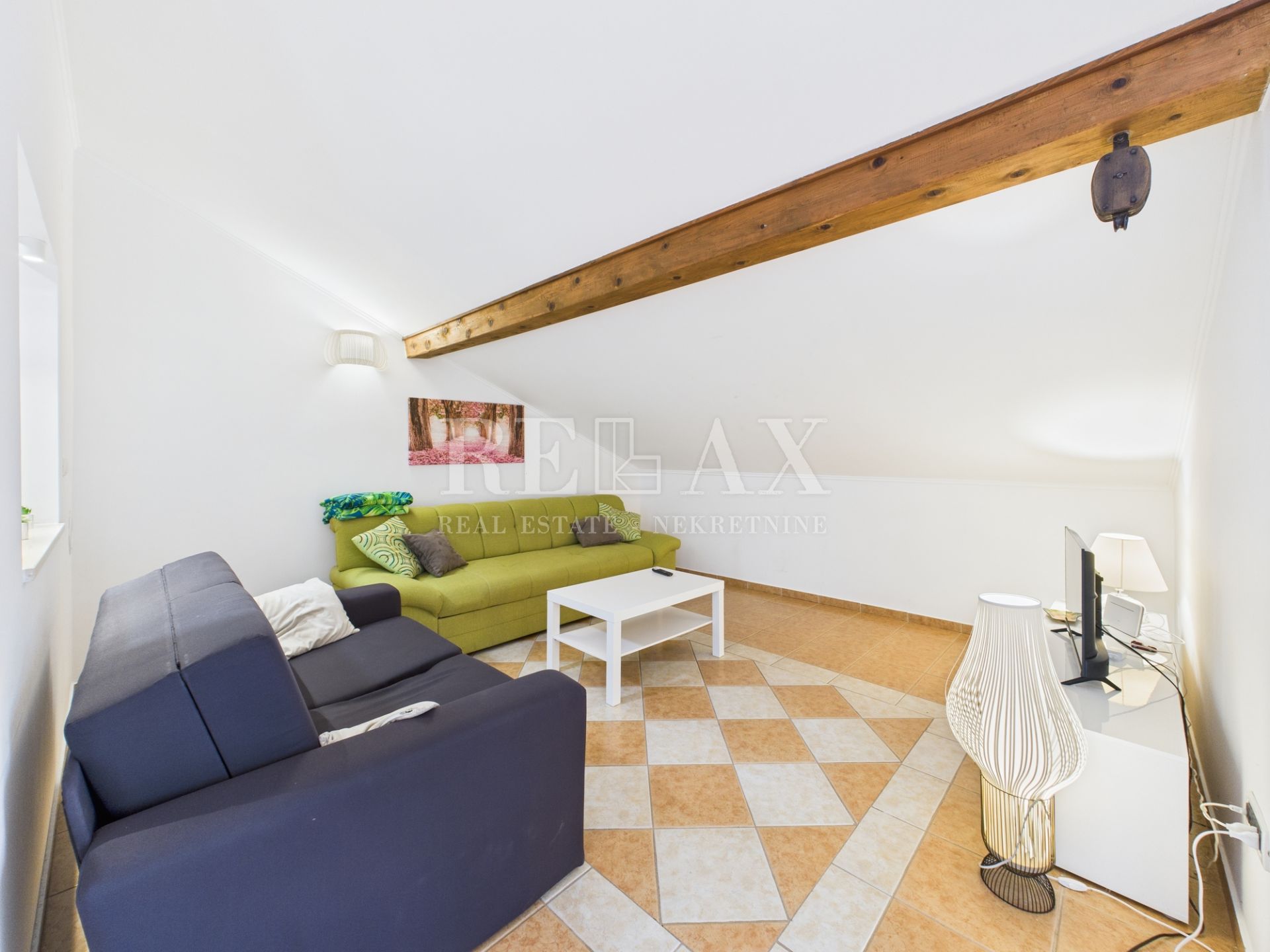 Opis: Na atraktivnoj lokaciji u Jadranovu, svega 70 metara hoda od mora i plaže, smjestio se ovaj stan u potkrovlju površine 86,43 m². Stan se nalazi u manjoj stambenoj zgradi izgrađenoj 2000. godine, a adaptiran je 2020. godine. Južna orijentacija i velika otvorena terasa od 12,19 m² pružaju obilje prirodne svjetlosti i nezaboravan panoramski pogled na more.