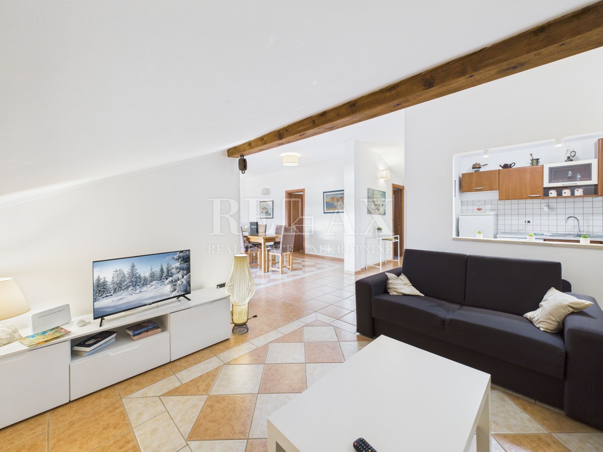 Stan se sastoji od ulaznog hola, hodnika, spremišta, kuhinje, kupaonice, spavaće sobe te povezanog prostora blagovaonice i dnevnog boravka. Otvorena terasa idealna je za uživanje u zalascima sunca i mediteranskoj atmosferi. Uz stan pripada i vanjsko stubište površine 6,12 m².