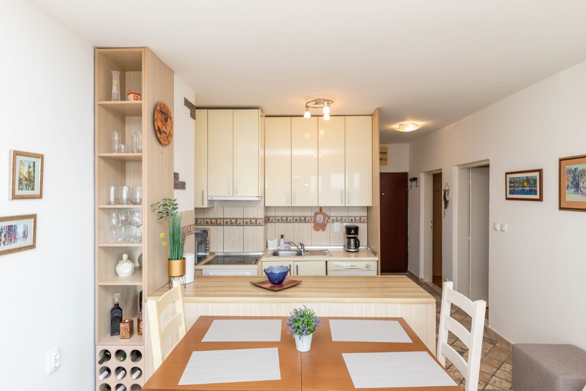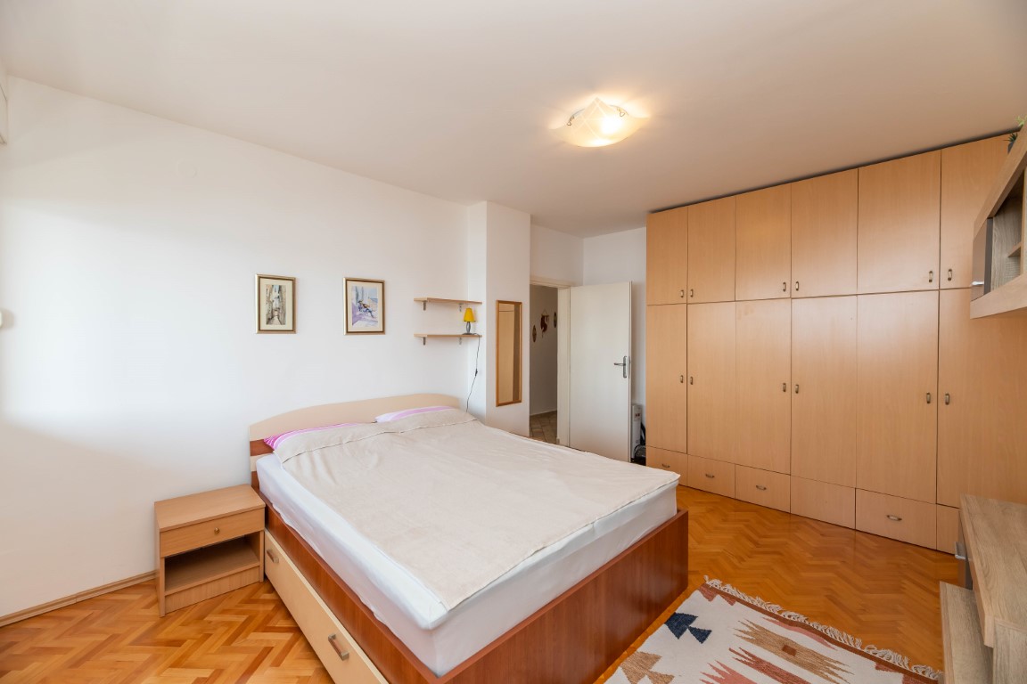 Stan je površine 60m2 (uknjižen 57m2) sa lođom sa koje se pruža prekrasan panoramski pogled na more.
