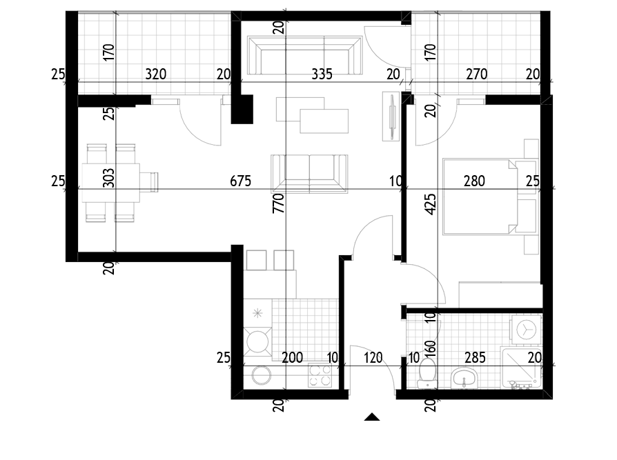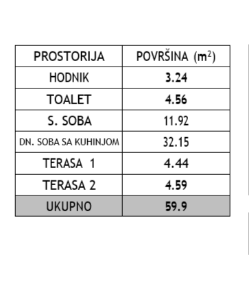 Struktura stana: ulazni hodnik, veliki dnevni boravak, kuhinja, spavaća soba, kupatilo i dvije terase.