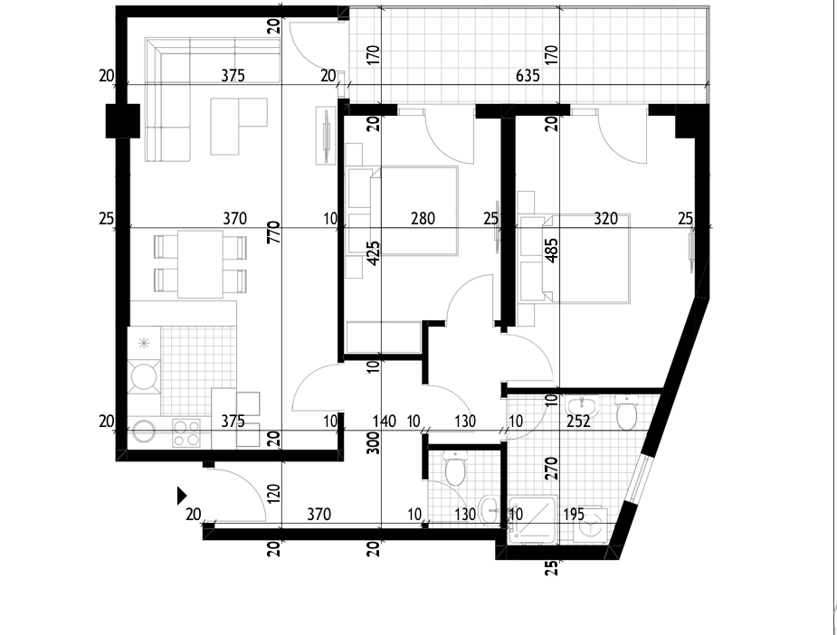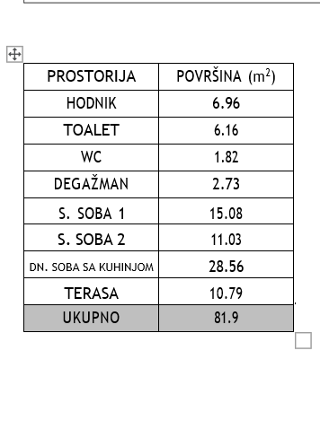 Struktura stana: ulazni hodnik, veliki dnevni boravak, kuhinja, dvije spavaće sobe, kupatilo, toalet, degažman i terasa.
