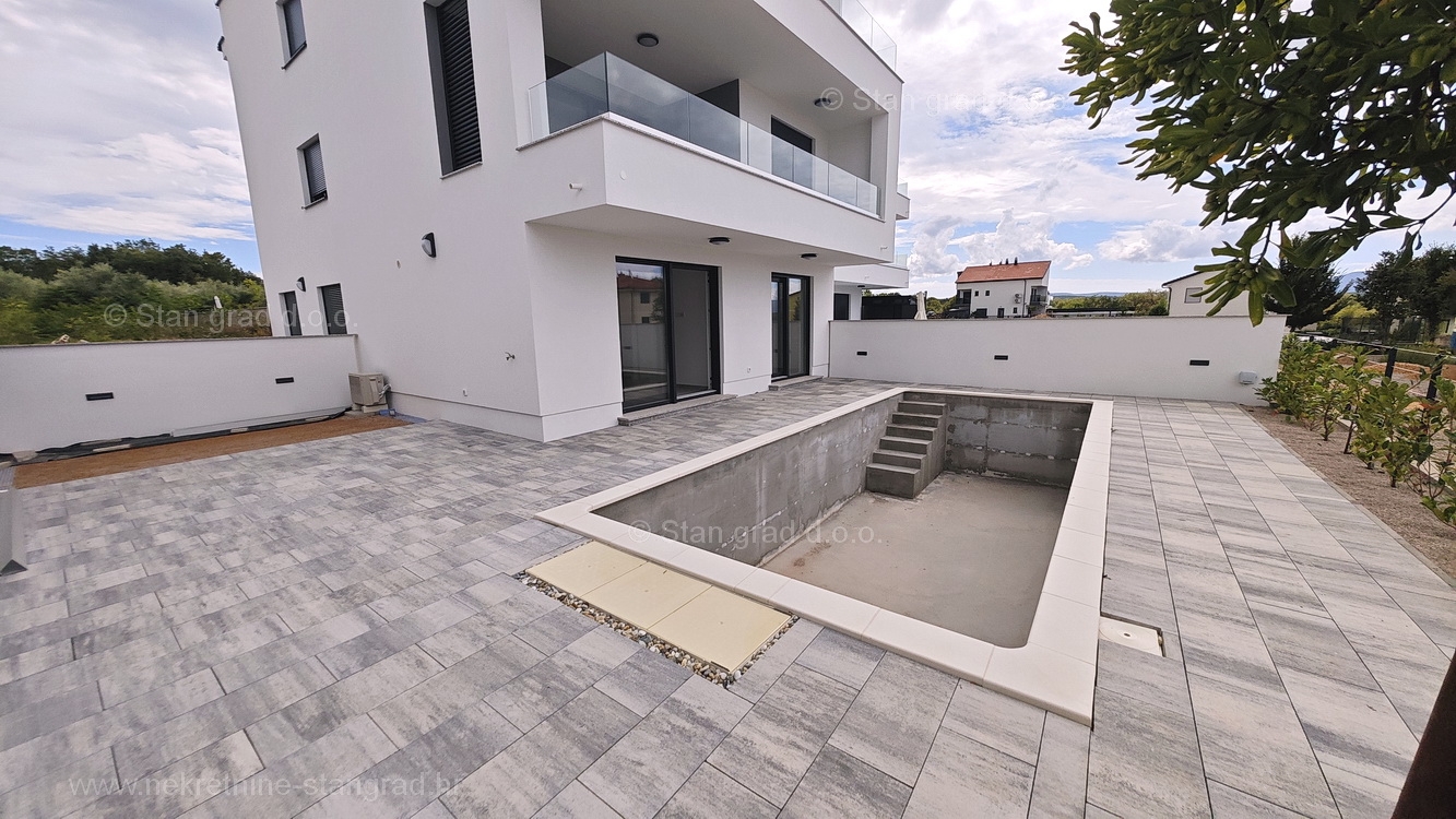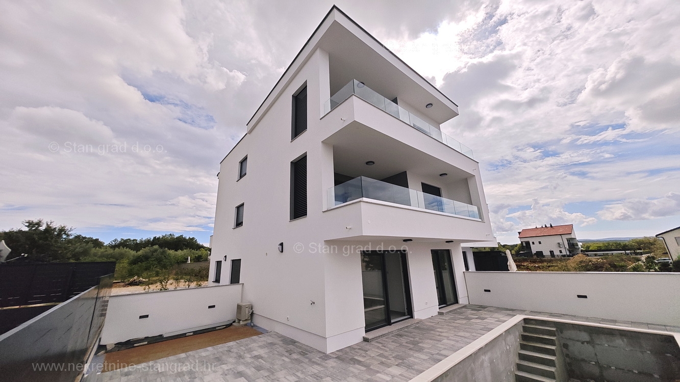Opis: Kod agencije Stan Grad Immobilien je u prodaji izniman apartman građen po modernom projektu na atraktivnom sjevernojadranskom području otoka Krka. Dostupna nekretnina je smještena na vrlo privlačnoj lokaciji u neposrednoj blizini središta mjesta Malinske. Radi se u naravi o prostranom apartmanu koji obuhvaća dvije pripadajuće stambene jedinice s vlastitim ulazom uklopljen u novi objekt sagrađen prema modernom projektu. Unutar solidno izgrađenog objekta, apartman je smješten na 1. etaži i dodatnog prostora odnosno u naravi apartmana u prizemnoj etaži. Površina ovih apartmana iznosi ukupno 125 m2. Unutar navedene površine su u prizemnom stanu obuhvaćeni hodnik, dnevni boravak i kuhinja s blagovaonom, 1 spavaća soba, 1 kupaonica, ostave i terase, a u stanu na katu su ulazni hodnik, dnevni boravak i kuhinja s blagovaonom, 2 spavaće sobe, kupaonice, zasebnog wc-a i natkrivene lođe. Nenamješteno, PVC stolarija s električnim roletama i komarnicima, podno grijanje, klima uređaj. Svakako je za napomenuti da vlasništvo opisanih apartmana uz sebe veže i dobro organiziranu okućnicu od 115 m2 na kojoj se nalazi bazen od 24 m2. Vlasništvu ovih apartmana pripadaju dva parkirna mjesta....