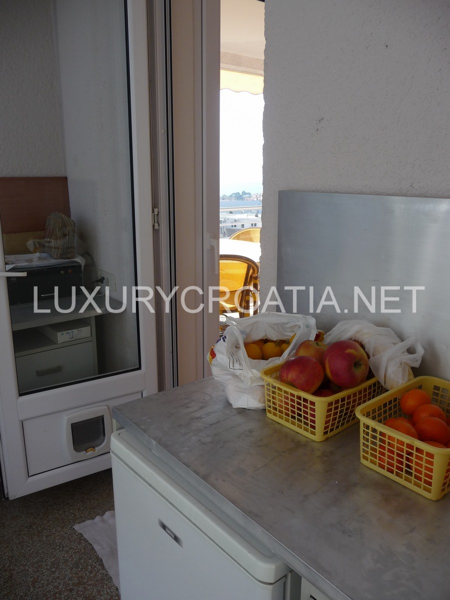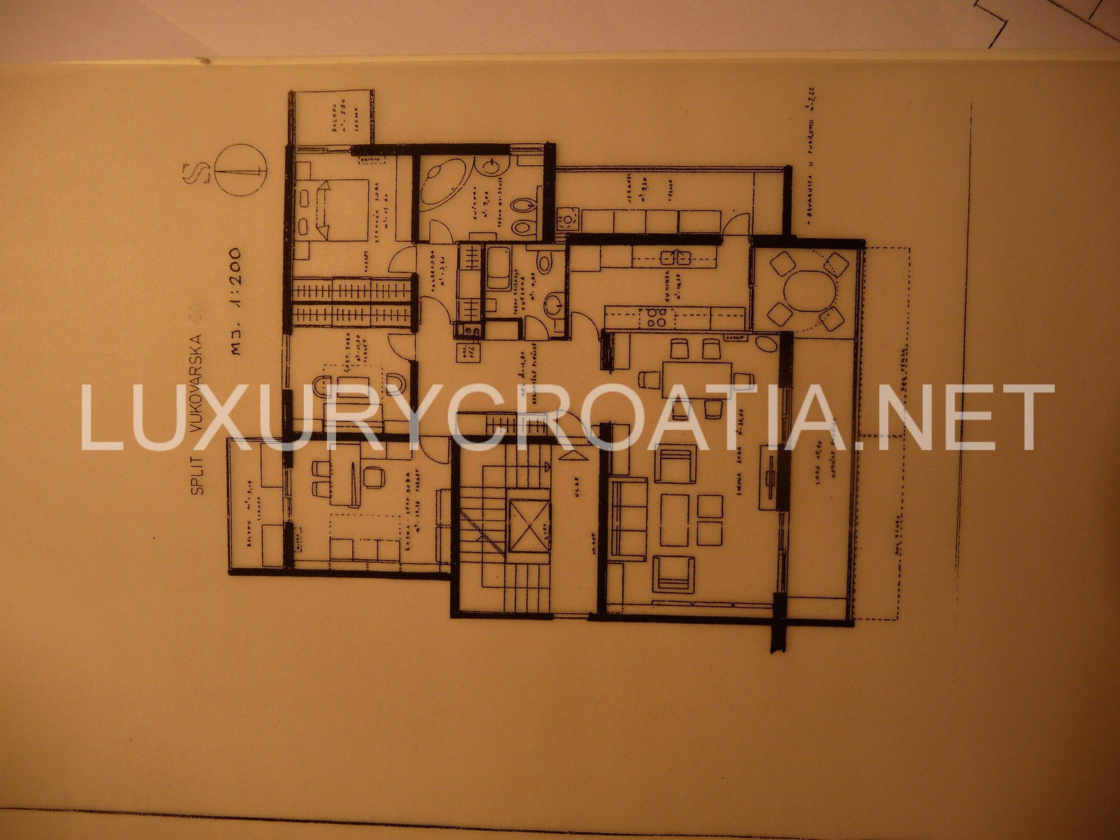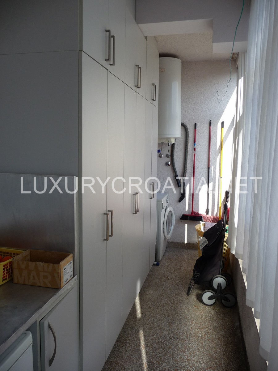 Opis: Apartments has 139 m2. Apartment is in residential building on the seventh floor. There are two apartments on the floor. Three air conditioning devices (Daikin) and floor heating in bathrooms. Apartment has a sea view from south and north side. It has two balconies (north and south), big loggia from kitchen (east) from utilities (boiler, washing machine, working desk, extra fridge, built-in closets), big loggia in front of living room with extended space for table and chairs, three bedrooms, two bathrooms, living room, kitchen. Apartment is renovated in 2006. with newest best materials. Kitchen has all equipment. In the apartment there are built-in closets ( 12-31 m2). There is a telephone, sat-TV and cable TV. Electricity, sewer. In the living room furniture is from well known designer ‘Kler’. Armored door. There is a new elevator in the building ( 2011. builted). Apartment has its own storage room in the basement of the building ( 7,22 m2 ).